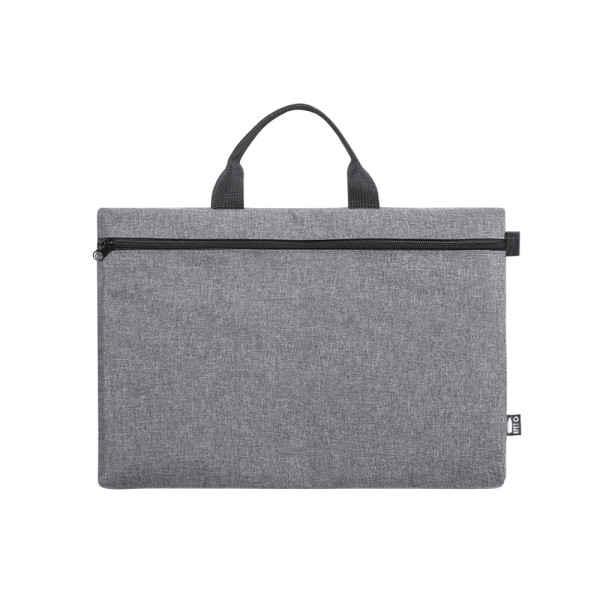 Dokumentenhalter der Natur Line und in widerstandsfähigem 600D RPET Melange-Effekt, hergestellt aus recyceltem Kunststoff, um die Wiederverwendung von Kunststoffabfällen zu fördern und zur Nachhaltigkeit des Planeten beizutragen. Schwarze Details und Hauptfach mit Reißverschluss. Stabile, passende Griffe und RPET-Plakette auf dem Außenetikett.