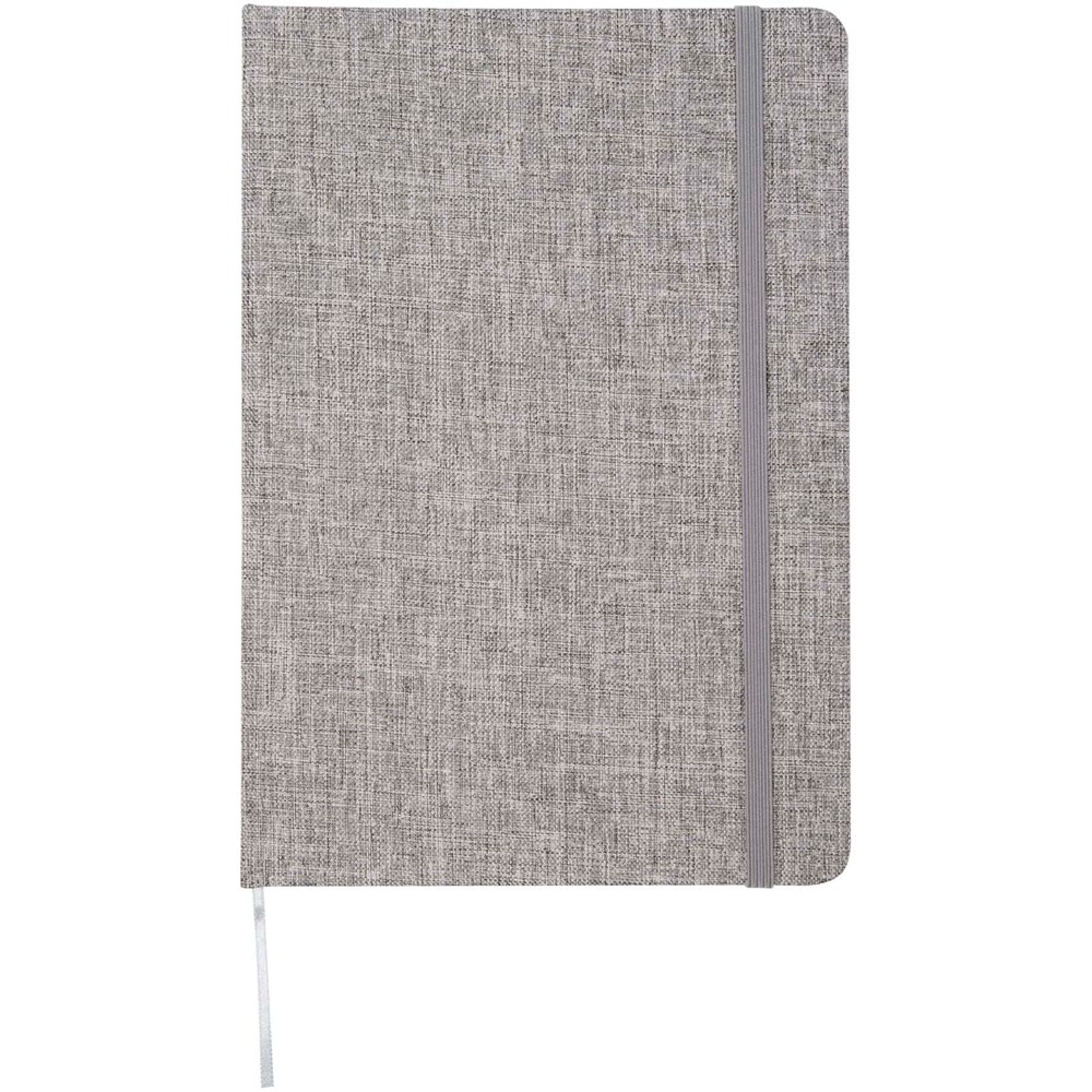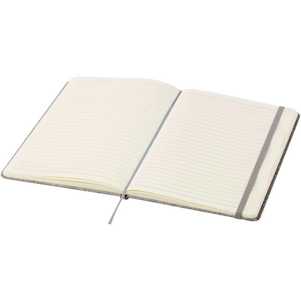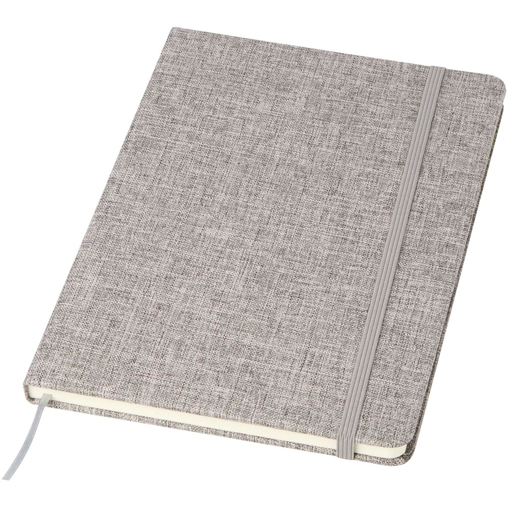 Hardcover Notizbuch im Format A5 aus Recyclingbaumwolle mit 80 Blatt liniertem 70 g/m² Papier. Das Notizbuch hat einen elastischen Verschluss, ein Lesebändchen und abgerundete Ecken.