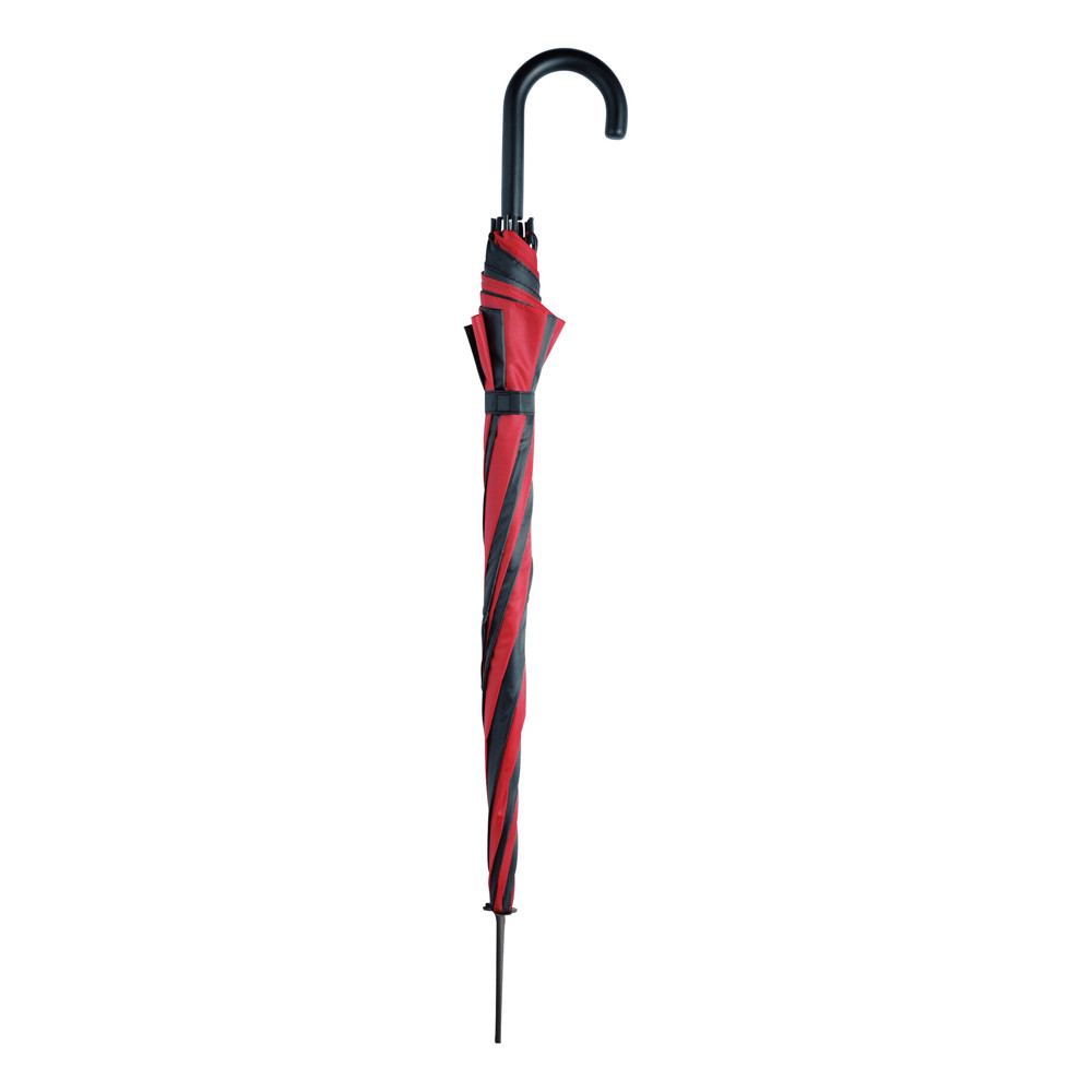 Automatischer Stockschirm DISCO: Metallstock und -speichen, Kunststofftips und -Rundhakengriff, Polyester-Bespannung, Schließband mit Klettverschluss
