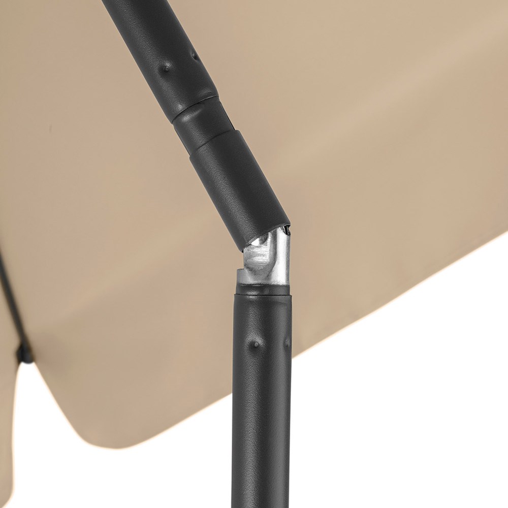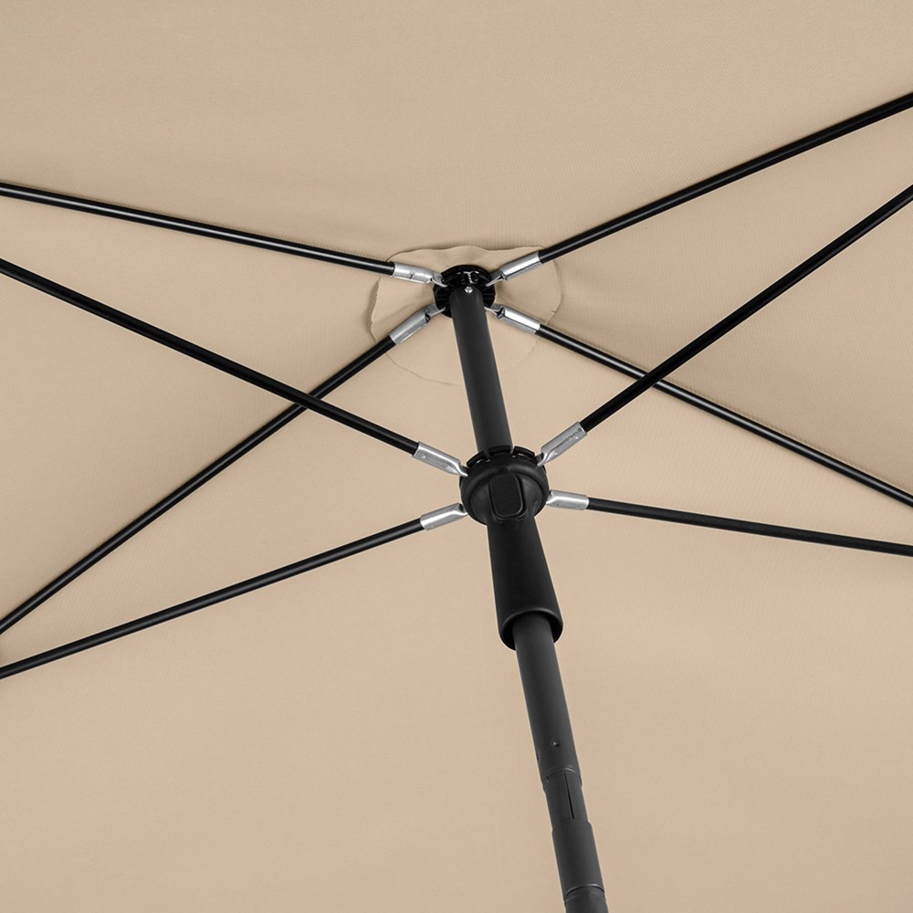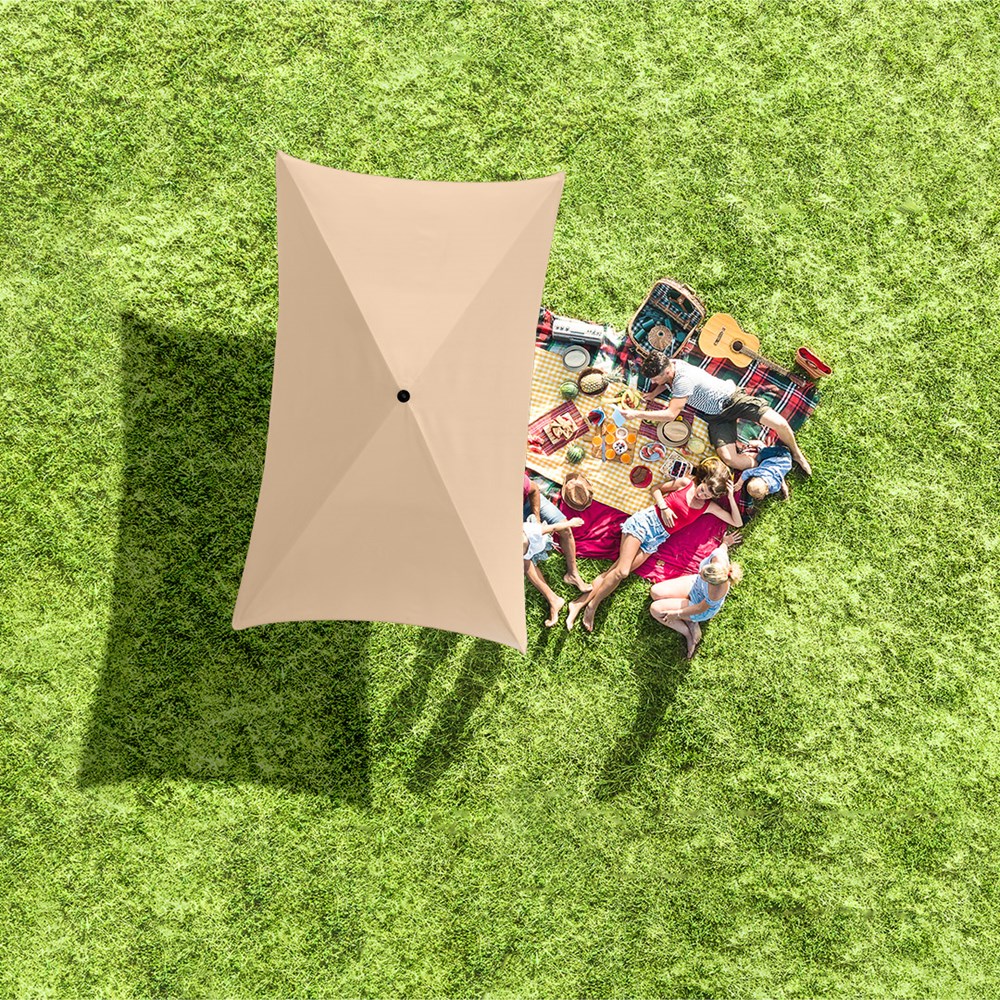 Moderner, rechteckiger Sonnenschirm mit Gestell in Titan-Finish, Knickvorrichtung und mit Volant Einfache Handhabung durch Sicherheitsschieber, sehr stabile Fiberglasschienen, zweiteiliger und stufenlos höhenverstellbarer Stock mit Knickvorrichtung zur Neigung des Schirms, Stock in edlem Titan-Finish, Unterstock mit ca. 119 cm Länge und Drehfeststeller zur sicheren Fixierung, komfortables Tragefutteral, hochqualitativer Bezug mit einer Grammatur von ca. 200 g/m² und Lichtschutzfaktor UPF 50+, exklusive Füllständer (Art. 8920 oder Art. 8905) / Erdspieß (Art. 8939)