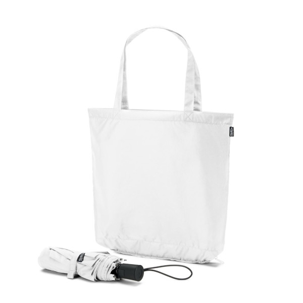 2-in-1-Regenschirm mit Einkaufstasche inklusive. Dieser ist aus recyceltem Polyester. Der 21''-Taschenschirm aus recyceltem Polyester (100% rPET) Pongee 190T, Fiberglasstäbe, Metallmast und Griff aus ABS (35% recycelt). Der Taschenschirm hat ein 3-schrittiges Schliesssystem, mit automatischer Öffnung und ist windfest. Die Einkaufstasche ist aus recyceltem Polyester, die zum Transport aufbewahrt oder separat verwendet werden kann. Ø 970 x 290 mm | Beutel: 420 x 390 mm