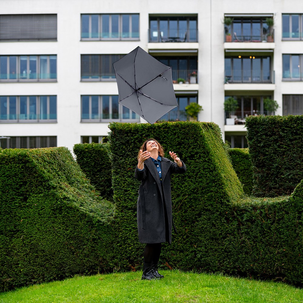 Filigraner Doppelautomatik-Taschenschirm in superleichter Ausführung Komfortable Automatik-Funktion zum schnellen Öffnen und Schließen, hochwertiges Windproof-PLUS-System für eine maximale Gestell-Flexibilität bei stärkeren Windböen, schwarzer Aluminiumstock, wassersparend gefärbtes Polyester-Pongee waterSAVE® Bezugsmaterial aus recycelten Kunststoffen, mit waterSAVE®-Label auf dem Schließband, matt-schwarzer Kunststoff-Softfeel-Griff mit Auslösetaste und Werbeanbringungsmöglichkeit, handtaschentauglich durch superleichtes Gewicht und kompakte Größe