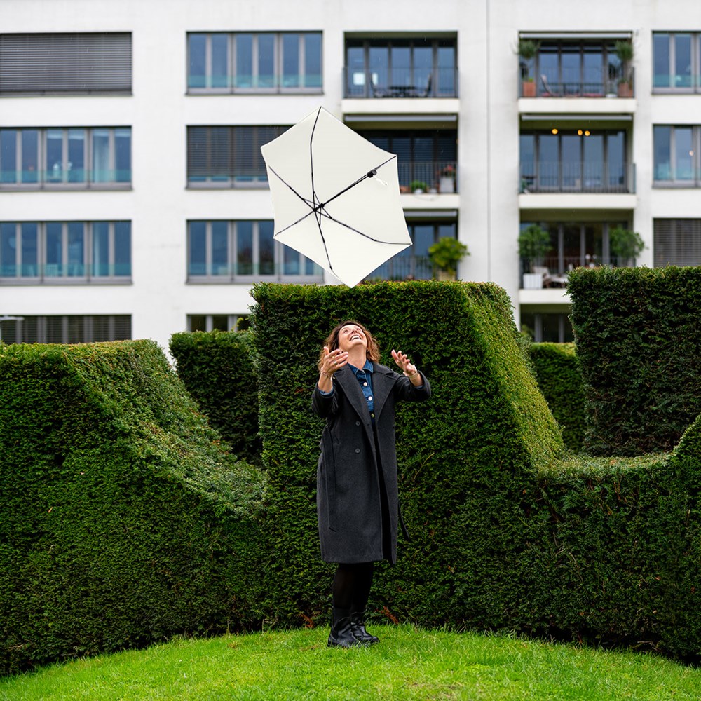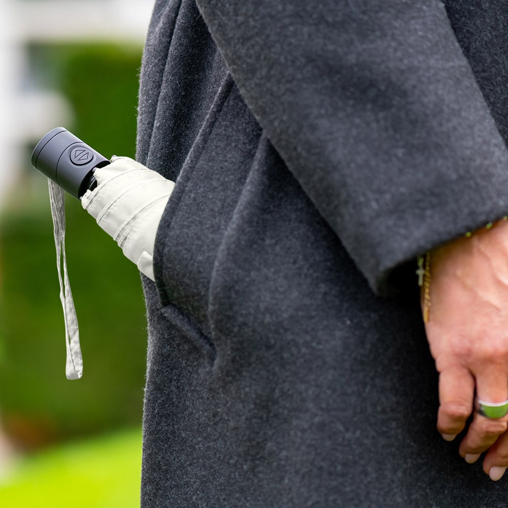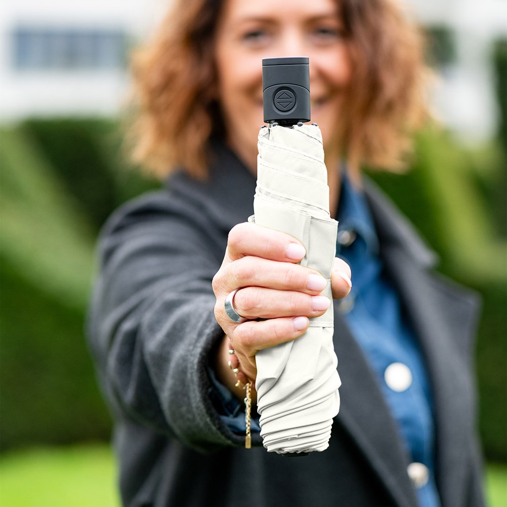Filigraner Doppelautomatik-Taschenschirm in superleichter Ausführung Komfortable Automatik-Funktion zum schnellen Öffnen und Schließen, hochwertiges Windproof-PLUS-System für eine maximale Gestell-Flexibilität bei stärkeren Windböen, schwarzer Aluminiumstock, wassersparend gefärbtes Polyester-Pongee waterSAVE® Bezugsmaterial aus recycelten Kunststoffen, mit waterSAVE®-Label auf dem Schließband, matt-schwarzer Kunststoff-Softfeel-Griff mit Auslösetaste und Werbeanbringungsmöglichkeit, handtaschentauglich durch superleichtes Gewicht und kompakte Größe