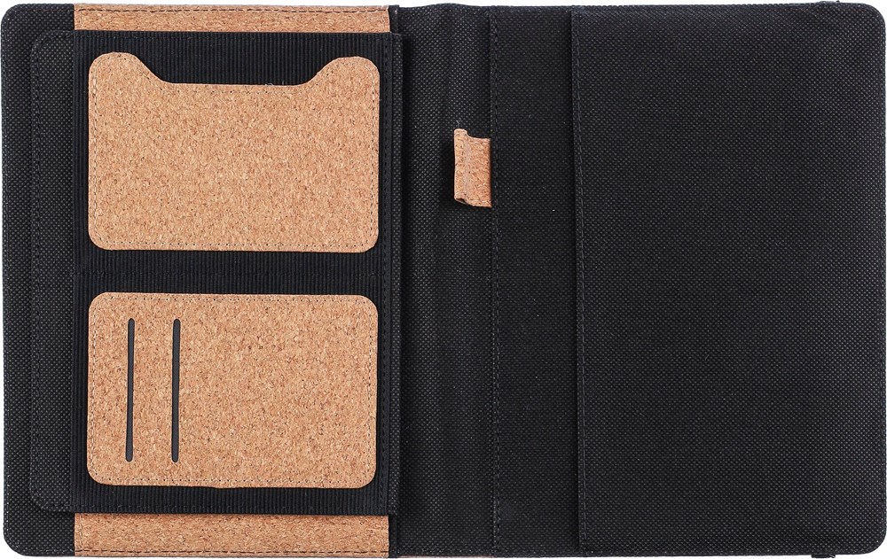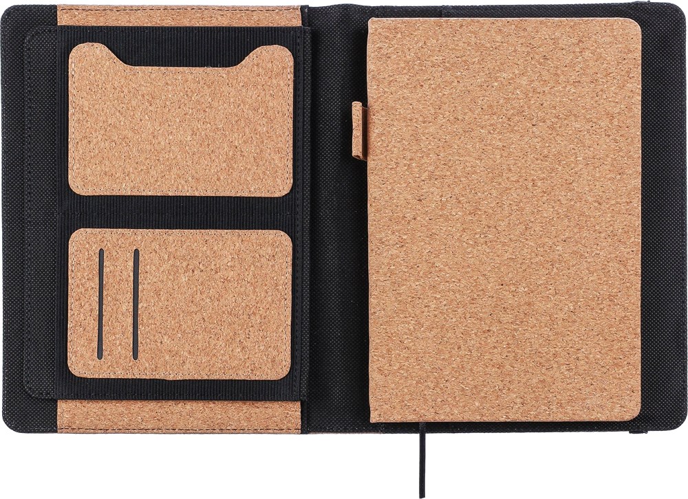 Mappe aus Kork, ca. A5-Format. Mit Innentaschen, elastischem Verschlussband, Stiftschlaufe und herausnehmbarem A5-Notizbuch mit 192 linierten Blättern aus Recyclingpapier (70 g/m2). Verpackt in Seidenpapier.