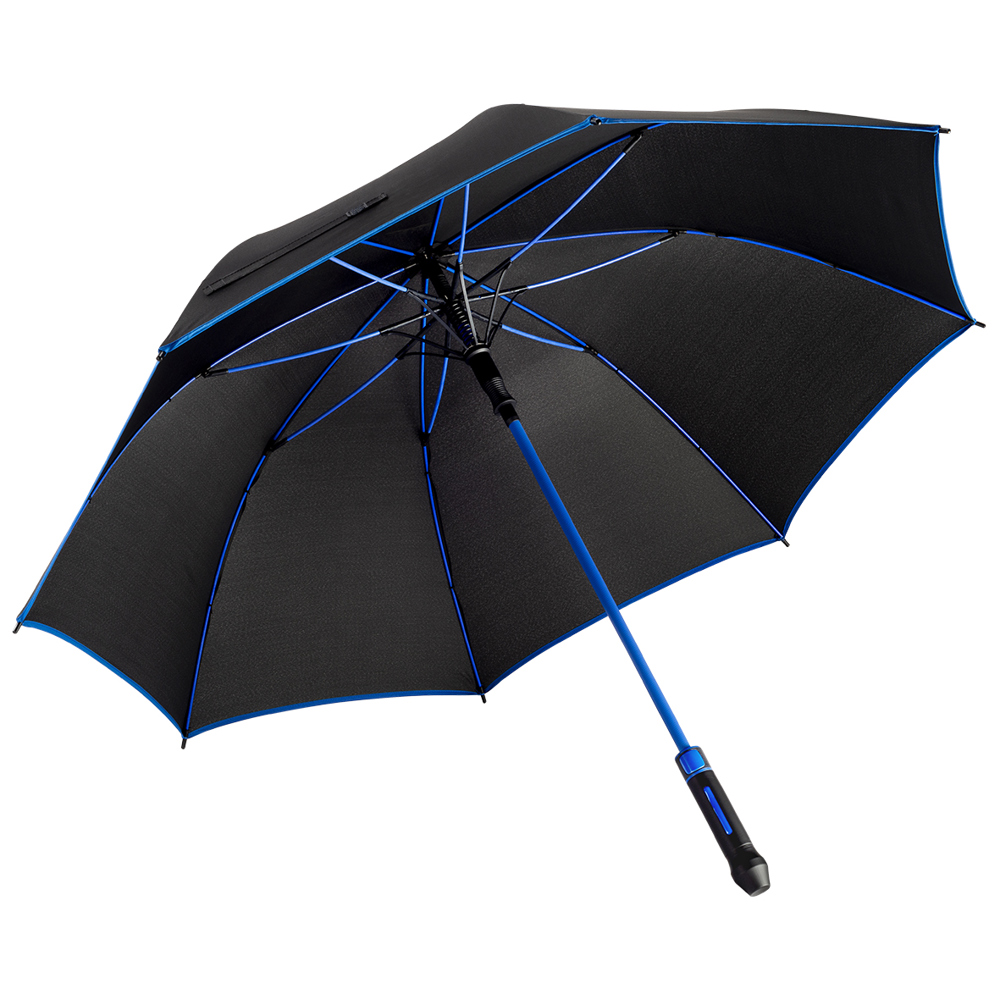 Der Regenschirm verfügt über eine Bespannung aus 190T Pongee mit farblicher Bordüre und einem Durchmesser von ca. 120 cm. Im geschlossenen Zustand ist er etwa 95 cm lang und lässt sich per Automatik öffnen. Der Schirm besteht aus 8 Segmenten und ist mit 68 cm langen Fiberglasspeichen sowie einem 14 mm Fiberglas-Schaft in der Farbe der Bespannung ausgestattet. Zudem bietet der Schirm eine Windproof-Funktion für zusätzliche Stabilität. Der schwarze, gummierte Kunststoffgriff kann mit seitlichem Doming veredelt werden und sorgt für einen komfortablen Halt.