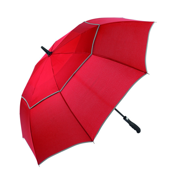 Der Schirm bietet eine Bespannung aus 190T Pongee mit zwei reflektierenden Bordüren für verbesserte Sichtbarkeit. Mit einem Durchmesser von ca. 113 cm bietet er optimalen Schutz vor Wind und Regen. Im geschlossenen Zustand misst der Schirm ca. 87 cm in der Länge. Die Automatikfunktion ermöglicht ein schnelles Öffnen. Der Schirm hat 8 Segmente und ist mit einer Windproof-Funktion ausgestattet, die ihn auch bei starkem Wind stabil hält. Der gummierte Profilgriff in schwarz sorgt für einen sicheren und komfortablen Halt.