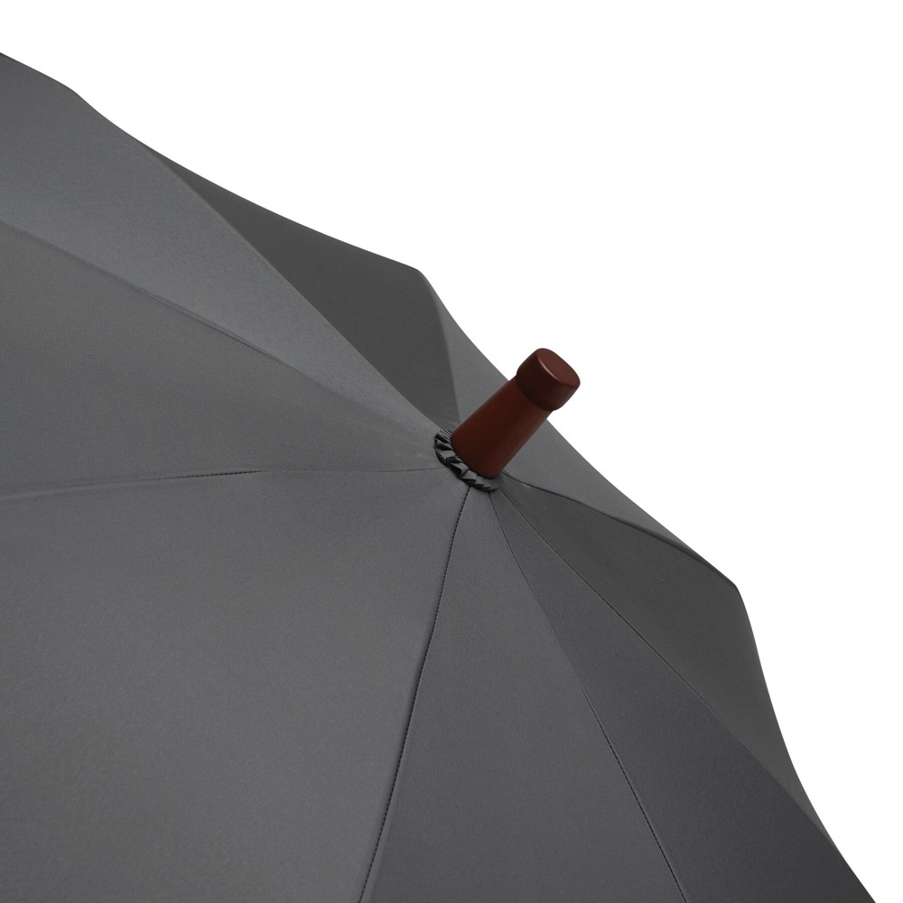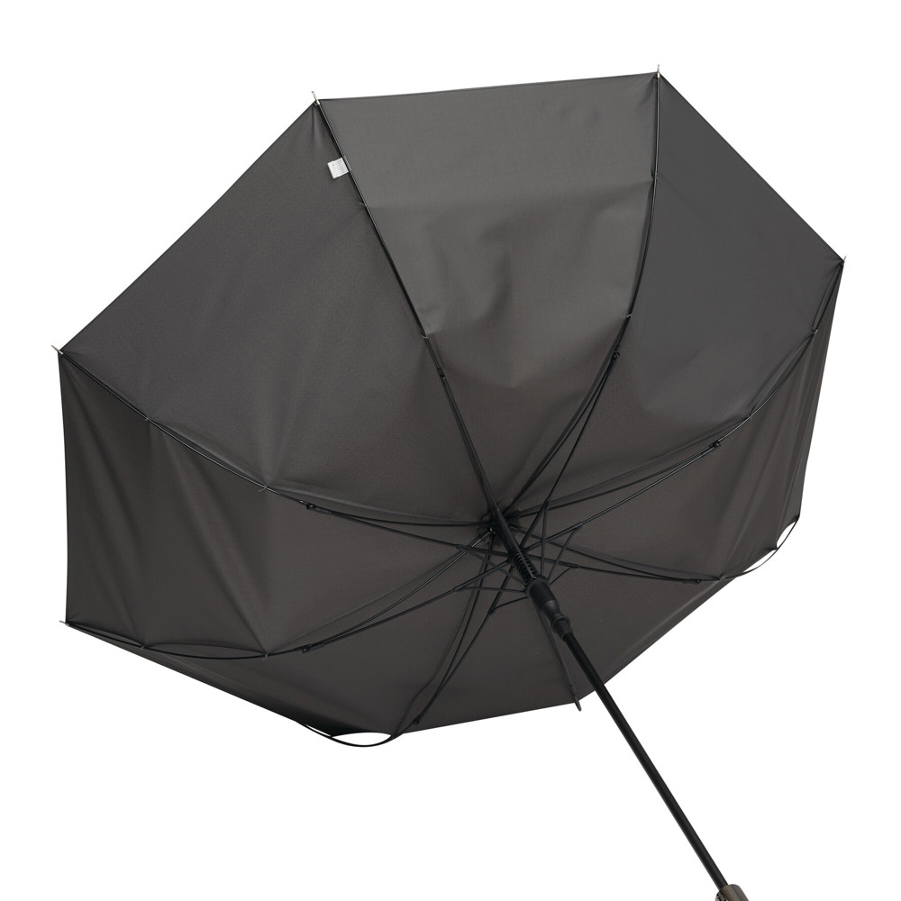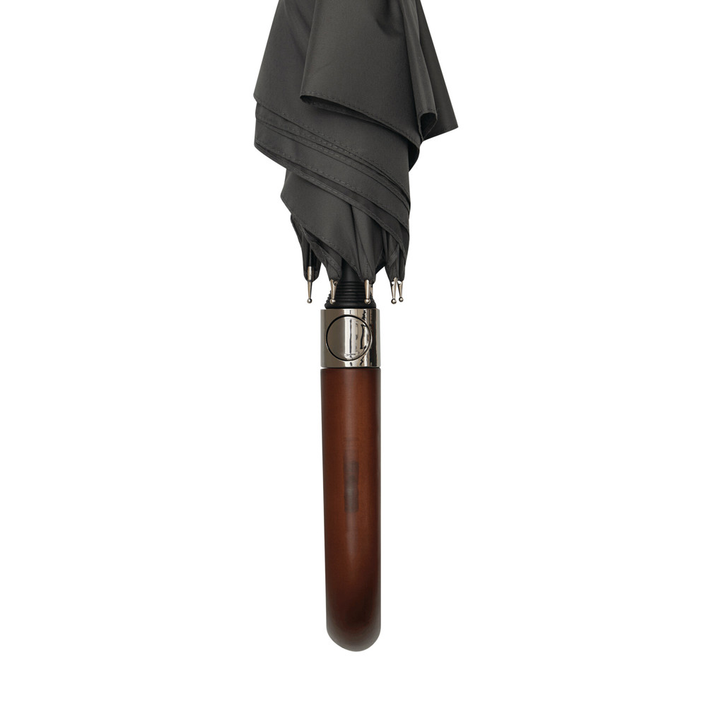 Automatik-Golfschirm EARL: schwarzer Metallstock, Fiberglasspeichen und Metalltips, Holzrundhakengriff und -spitze, Griff mit integrierter Automatik-Auslösetaste, hochwertige Polyester-Pongee-Bespannung, Schließband mit Druckknopf