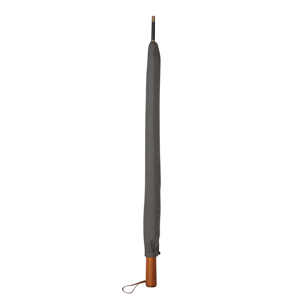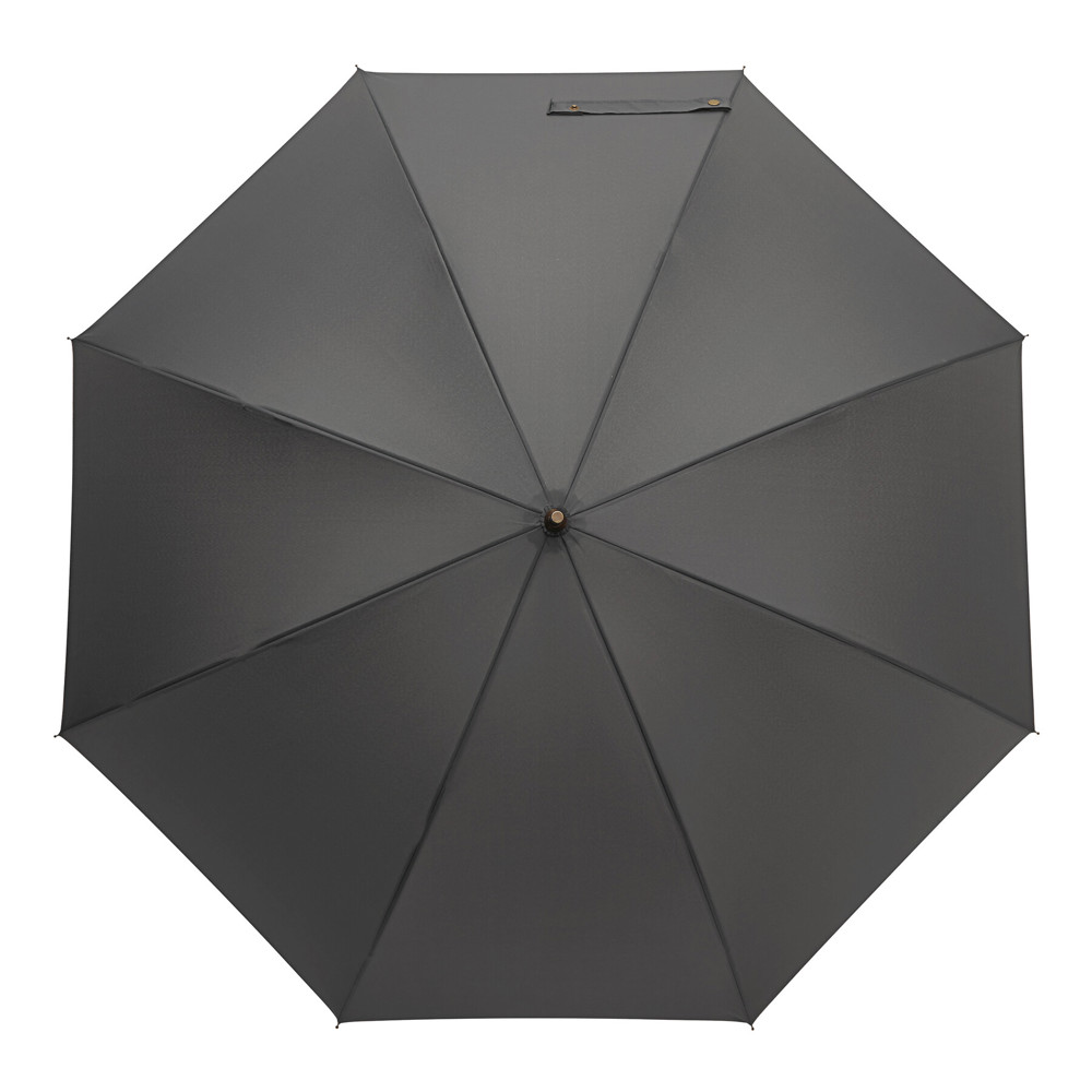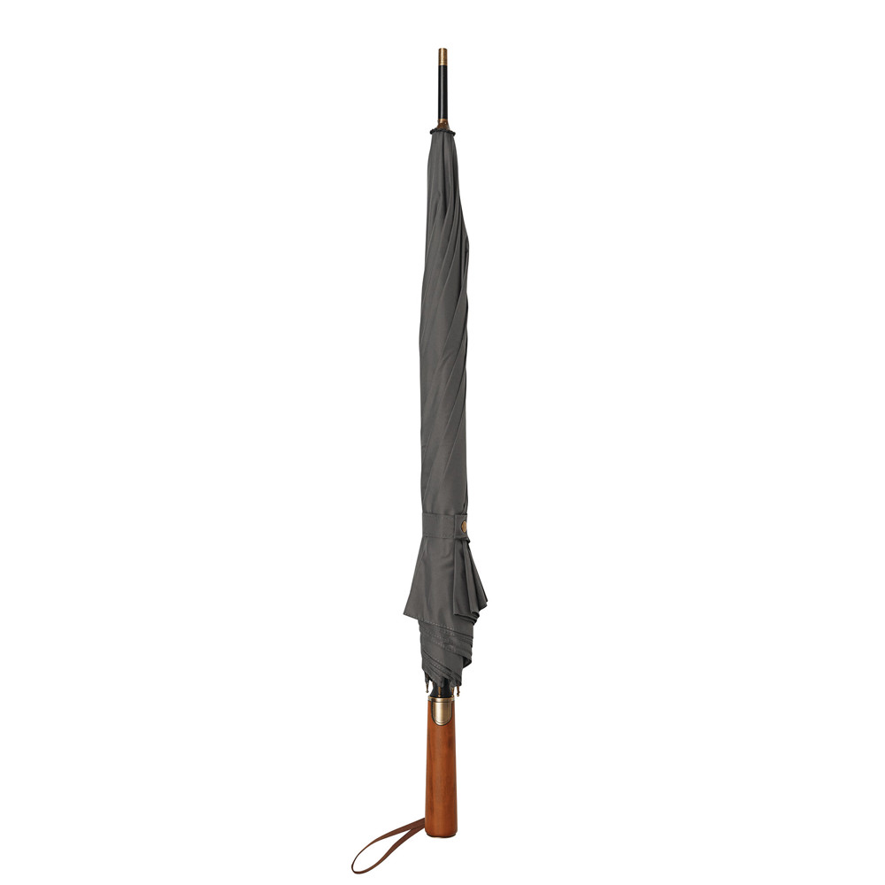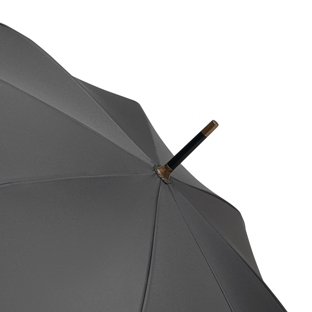 Automatik-Stockschirm POLKA: schwarzer Metallstock, Fiberglasspeichen und Metalltips, gerader Holzgriff mit messingfarbener Automatik-Auslösetaste, Griff mit „CREADO“-Doming, hochwertige Polyester-Pongee-Bespannung und -Hülle, Schließband mit Druckknopf