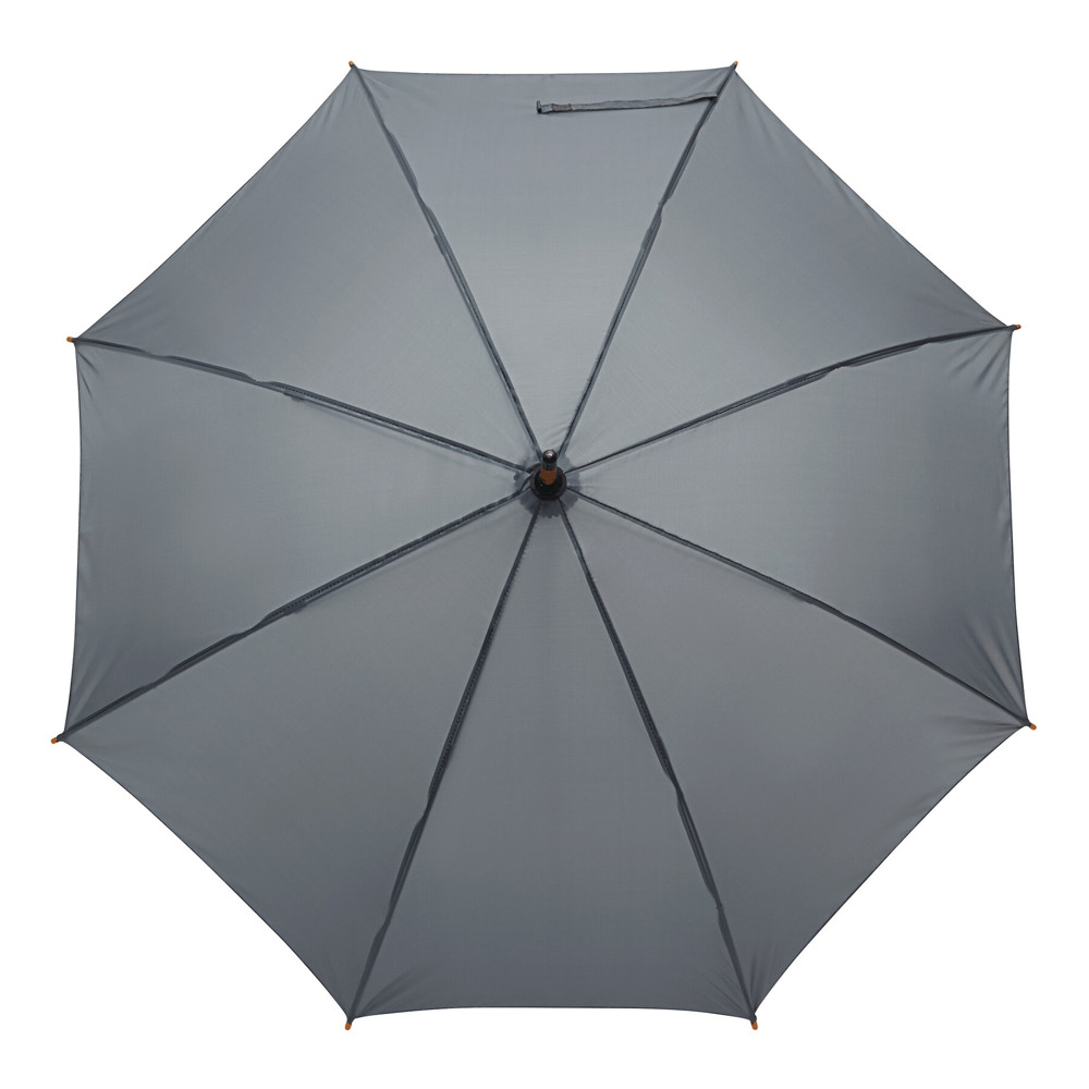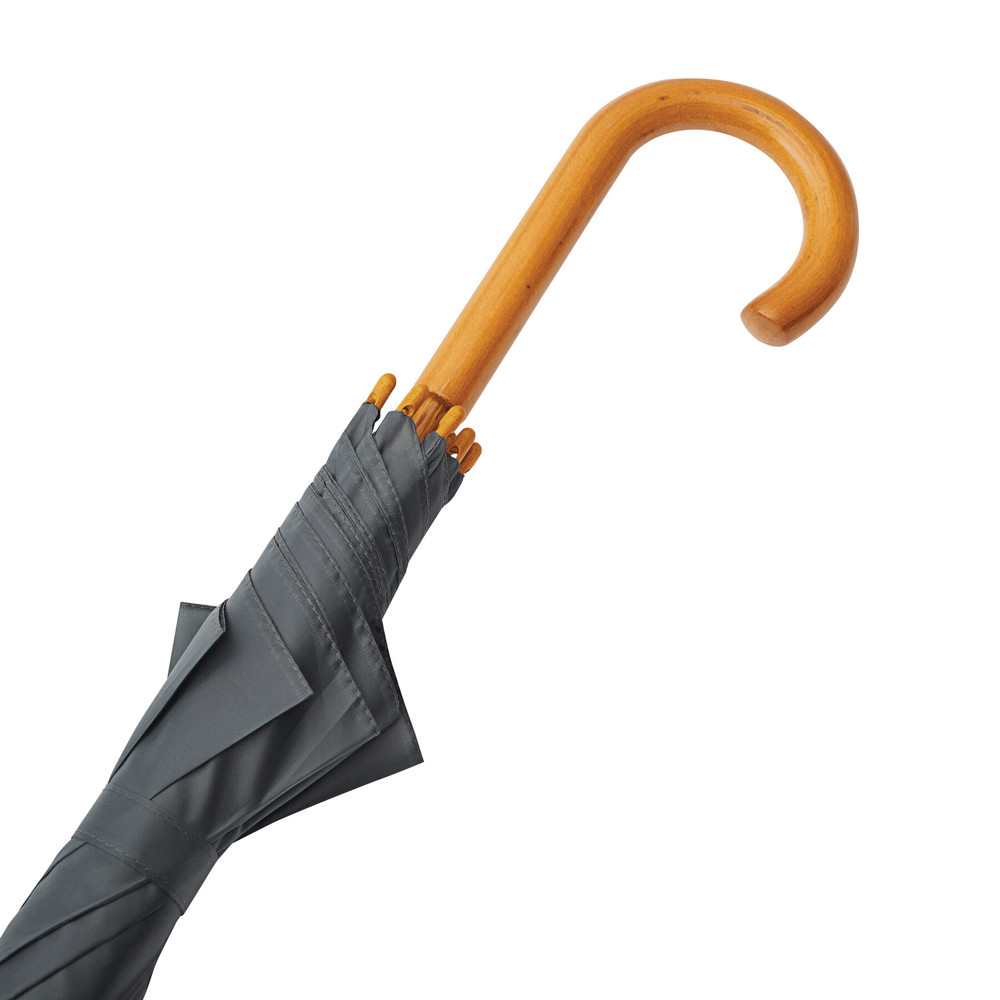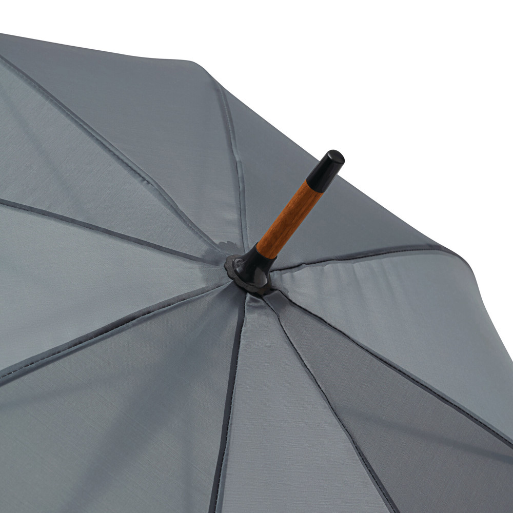 Automatik-Holzstockschirm JAZZ: Fiberglasspeichen, Holztips und -Rundhakengriff, Polyester-Bespannung aus recycelten Kunststoffen / RPET, Schließband mit Klettverschluss