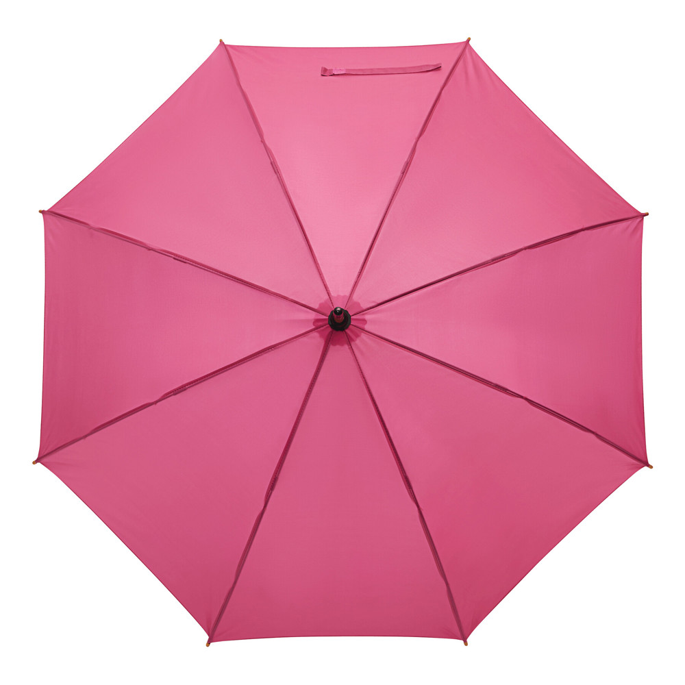 Automatik-Holzstockschirm JAZZ: Fiberglasspeichen, Holztips und -Rundhakengriff, Polyester-Bespannung aus recycelten Kunststoffen / RPET, Schließband mit Klettverschluss