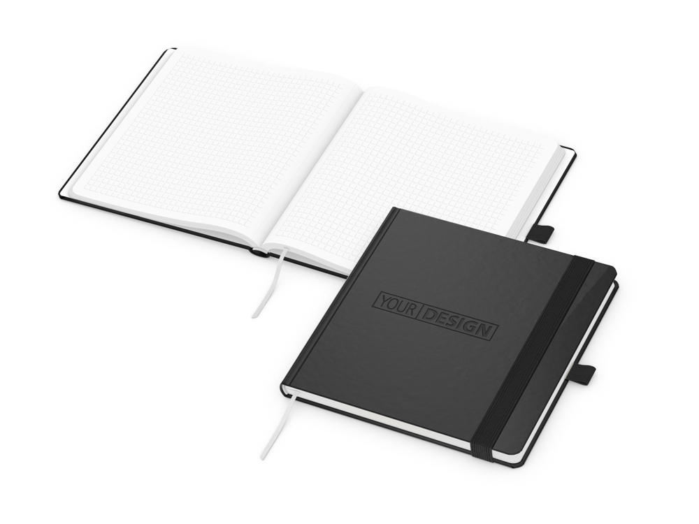 Das Square-Book Bestseller kombiniert ein modernes Format, hochwertige Verarbeitung und elegante Individualisierungsmöglichkeiten. Es ist die perfekte Wahl für Unternehmen, die ein stilvolles und repräsentatives Notizbuch suchen. • Format: 170 × 170 mm (Blattformat) • Umfang: 192 Seiten • Verarbeitung: Hardcover mit unwattierter Buchdecke; Buchblock und -decke mit abgerundeten Ecken; Lesezeichen weiß und Kapitalband cremeweiß; runder Rücken • Ausstattung: Notizseiten mit Winkelkaro; Mikroperforation; Gummiband 15 mm und Stiftschlaufe schwarz • Einband: Tivoli-Soft tiefschwarz • Material: Weißes Schreibpapier 90 g/m² • Werbefläche: 100 × 50 mm • Druck: Blindprägung inklusive (zzgl. Prägestempelkosten)