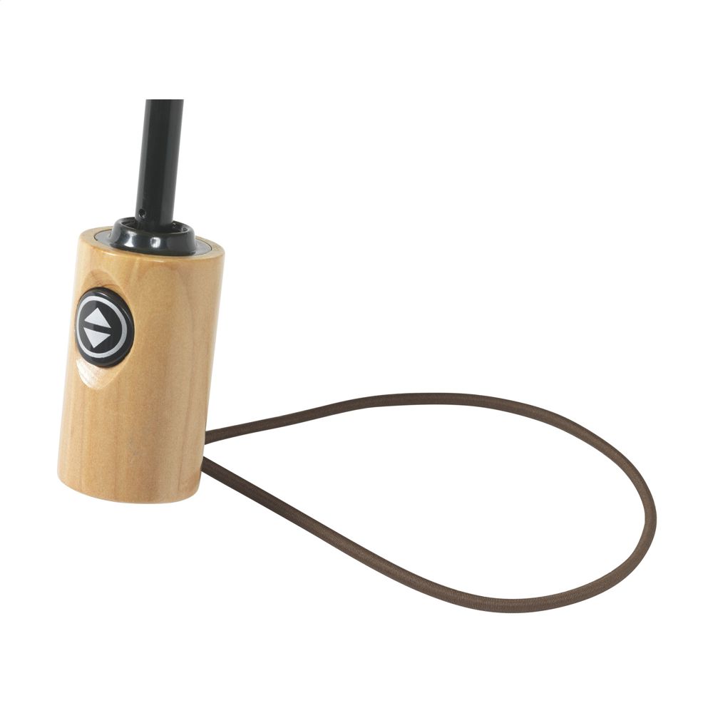 Faltbarer Regenschirm mit automatischem Öffnungs- und Schließmechanismus. Mit einem RPET 190T Pongee-Polyester-Bezug. Dieser Regenschirm ist mit einem Schaft und einem Gestell aus Edelstahl, einem Holzgriff, einer elastischen Handschlaufe und einem Klettverschluss ausgestattet. Lieferung in einer Aufbewarungshülle. Länge zusammengefaltet: 28 cm. Maße zusammengeklappt: Ø 6 x 28,5 cm. RCS-zertifiziert. Recyceltes Material insgesamt: 16%.