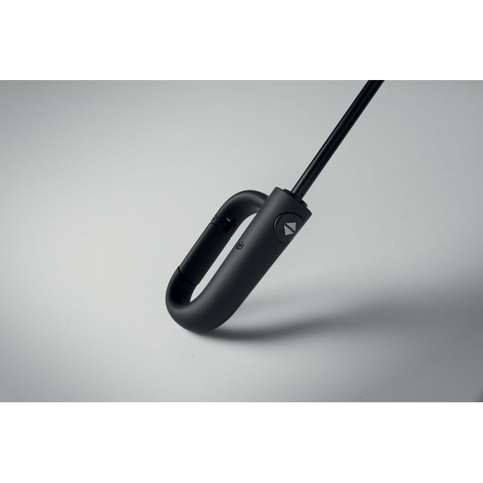 21'' Regenschirm aus 190 T RPET Pongee. Windbeständig. Schwarz überzogenes 2-teiliges Fiberglasgestell, Stangen aus Fiberglas. Gummierter D-förmiger Karabinergriff. Passende Schirmhülle. Automatische Öffnung und Schließung.