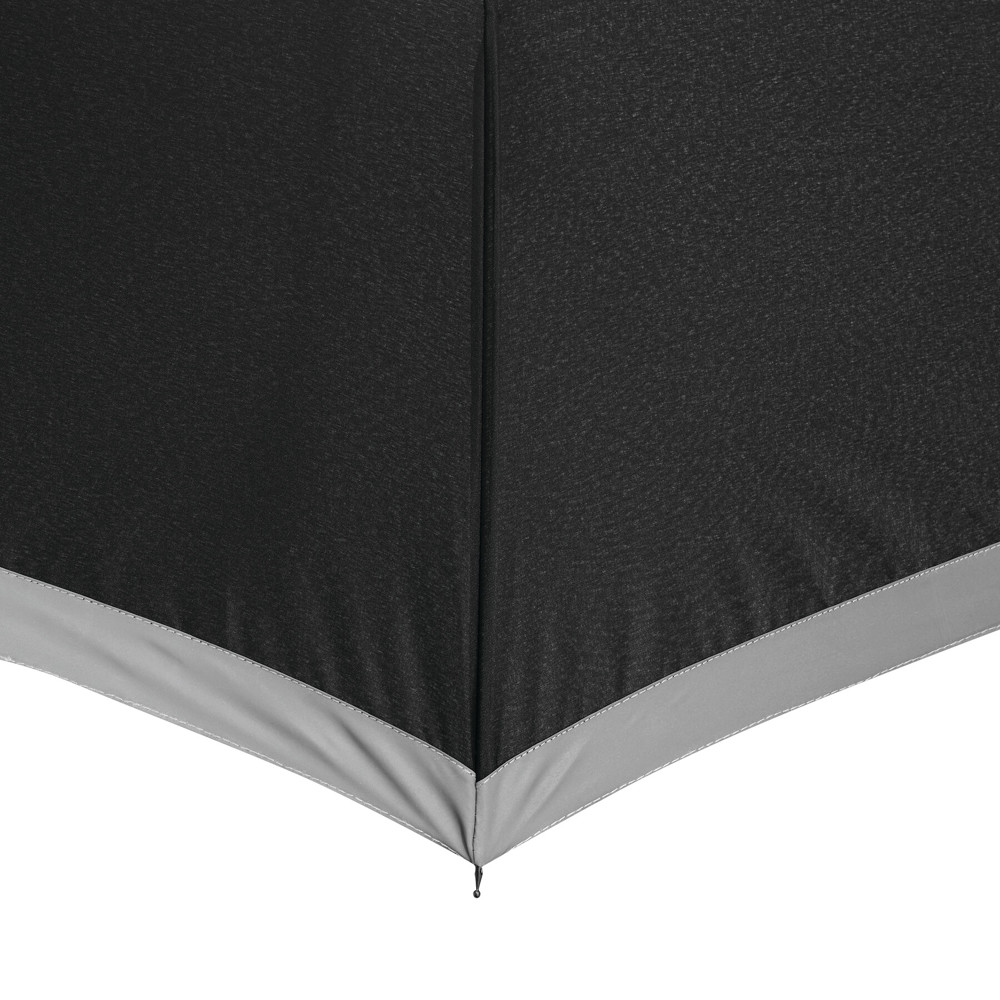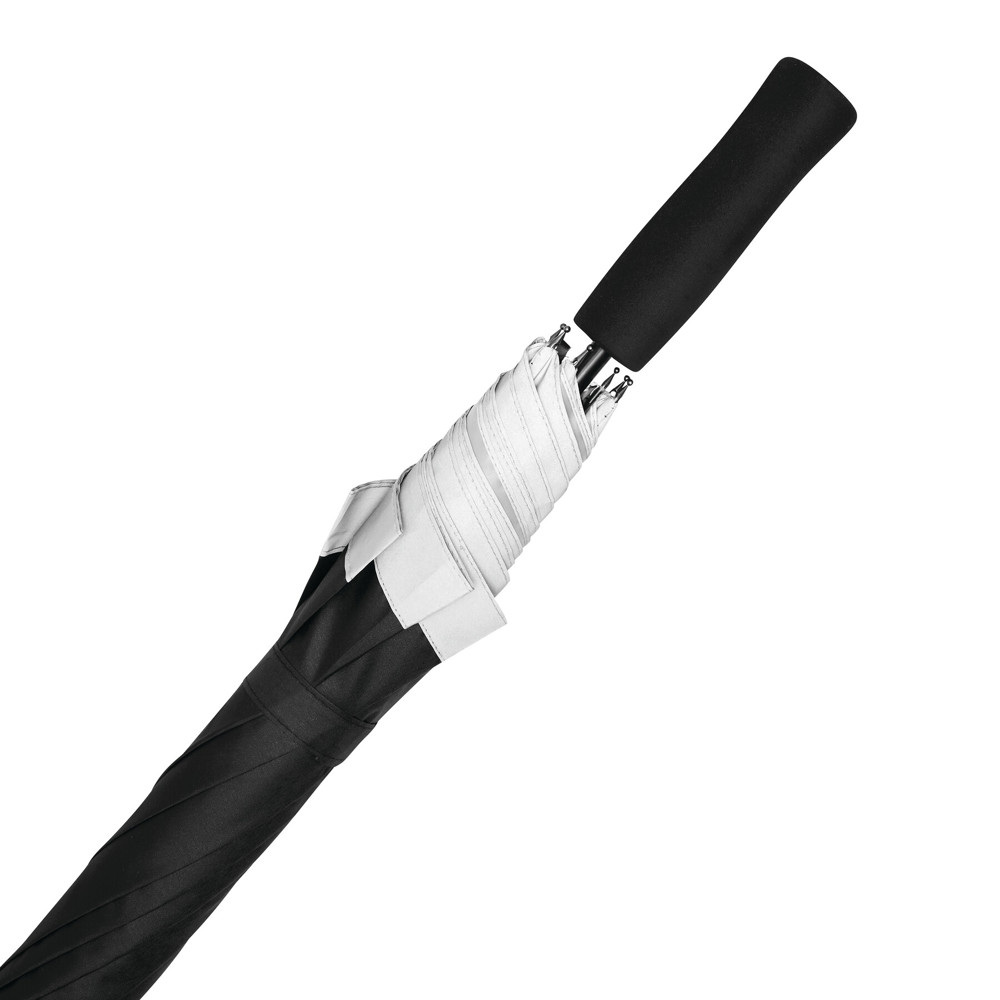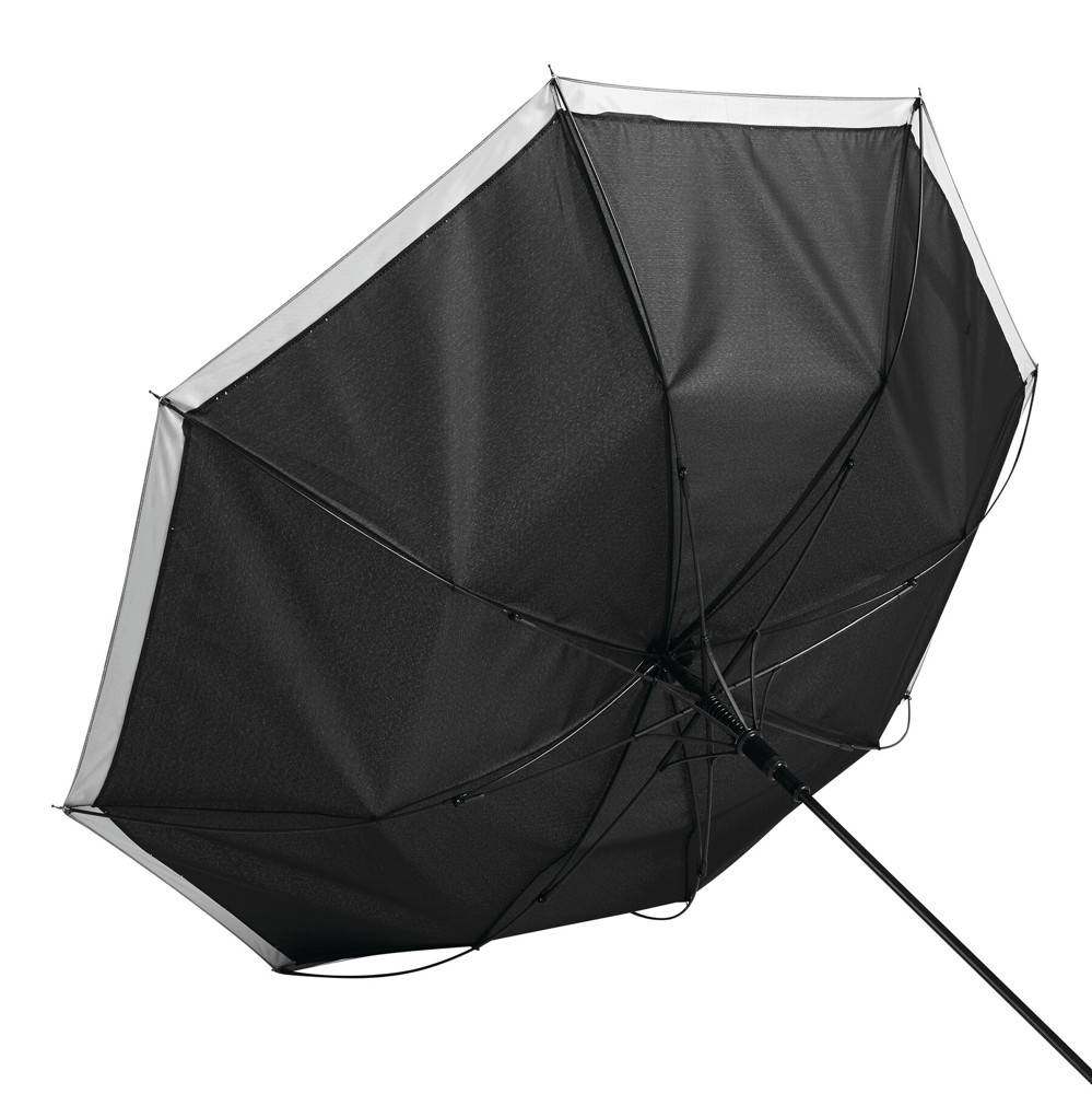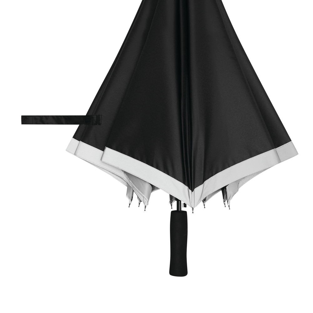 Automatischer Stockschirm CALIMA: Metallstock, Fiberglasspeichen, Metalltips, EVA-Griff, Polyester-Pongee-Bespannung aus recycelten Kunststoffen / rPET, mit silberfarbener, reflektierender Umrandung, Schließband mit Klettverschluss