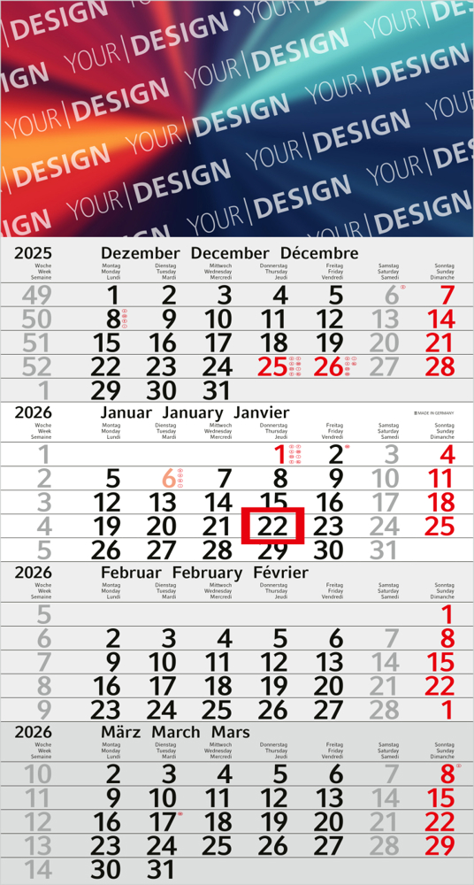 Der Budget 4 x.press ist die ideale Wahl für Unternehmen, die einen funktionalen und modernen 4-Monatskalender benötigen, ohne auf schnelle Verfügbarkeit zu verzichten. Mit einer Produktionszeit von nur 3 Arbeitstagen, rot akzentuiertem Kalendarium und einer großzügigen individuell bedruckbaren Werbefläche überzeugt dieser Kalender durch Qualität und Flexibilität. Perfekt für kurzfristige Marketingaktionen.