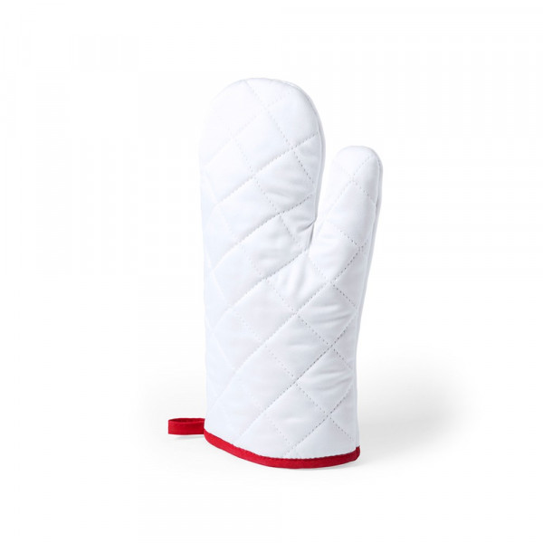 Küchenhandschuh aus weichem 100 % Polyester in Weiß mit Rändern in kräftigen Farben. Mit Schlaufe zum Aufhängen und einer glatten Seite - speziell für den Sublimationsdruck entwickelt.