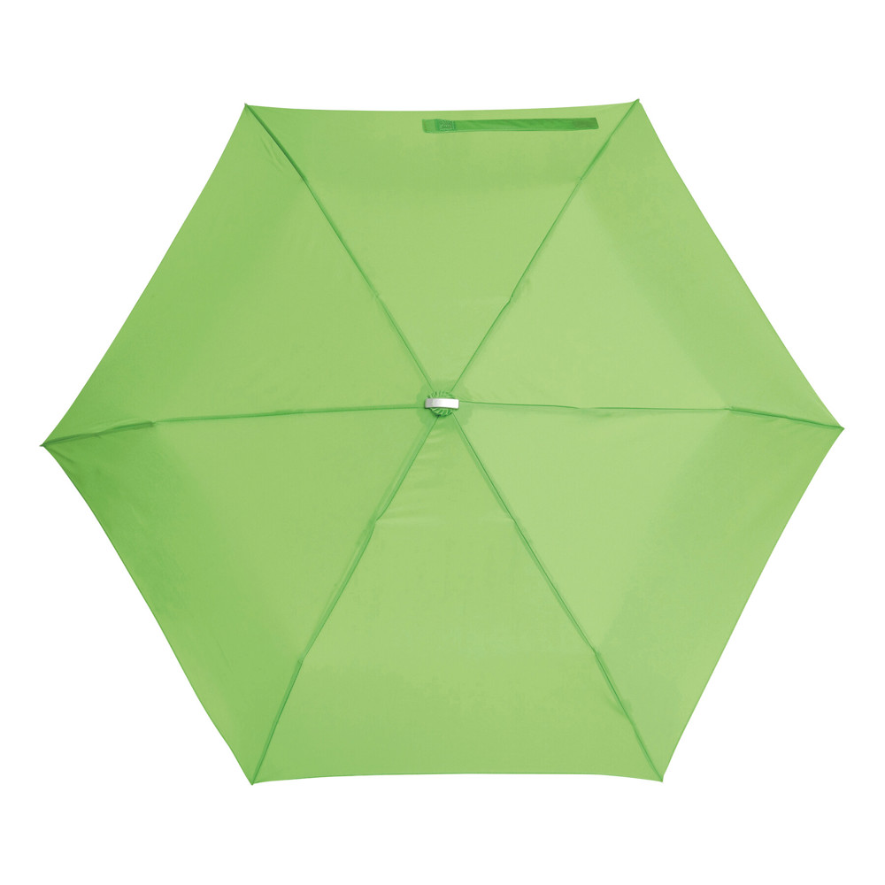 Super flacher Mini-Taschenschirm FLAT in farblich abgestimmtem Futteral: 164g-leichtes Windproof-Gestell, 3-teiliger Aluminiumstock, mit Aluminium- / Fiberglasspeichen und Metalltips, Kunststoffgriff mit Handschlaufe, Polyester-Pongee-Bespannung, Schließband mit Klettverschluss