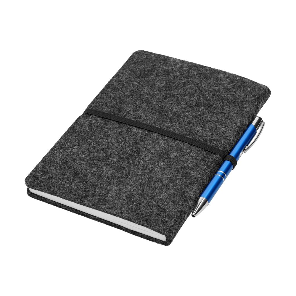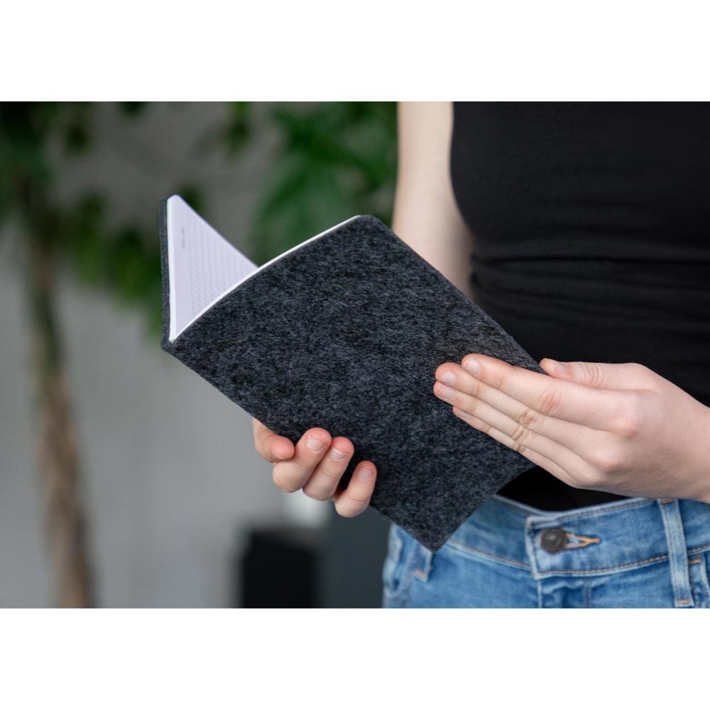 Modernes Notizbuch mit Filz-Einband in anthrazit und schwarzem Gummiband zum Verschließen. 80 Blatt (kariert) im Format DIN A5. Papierqualität: weiß 70g/qm, double-side offset.