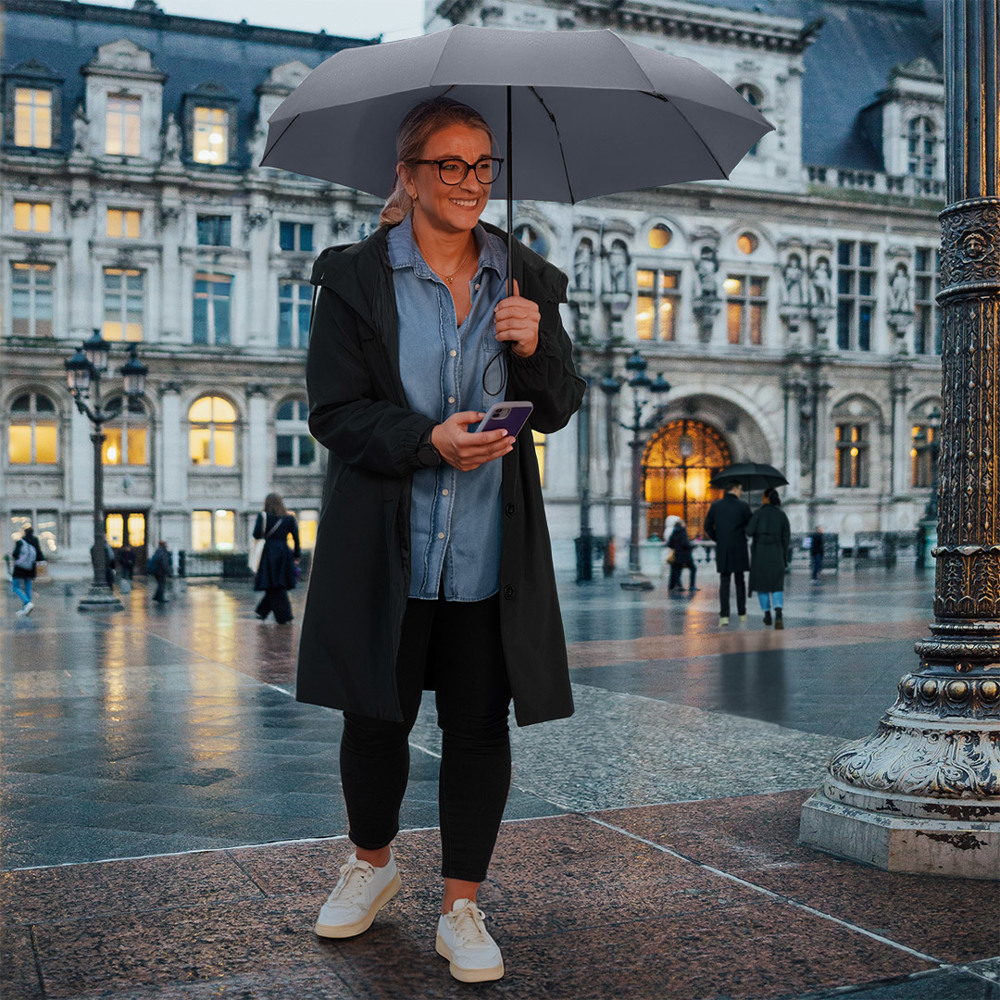 Kompakter Handöffner-Taschenschirm mit hervorragendem Preis-Leistungs-Verhältnis und Windproof-PLUS-System Einfache Handhabung durch Sicherheitsschieber, hochwertiges Windproof-PLUS-System für eine maximale Gestell-Flexibilität bei stärkeren Windböen, Soft-Feel-Griff mit elastischer Tragekordel und Werbeanbringungsmöglichkeit