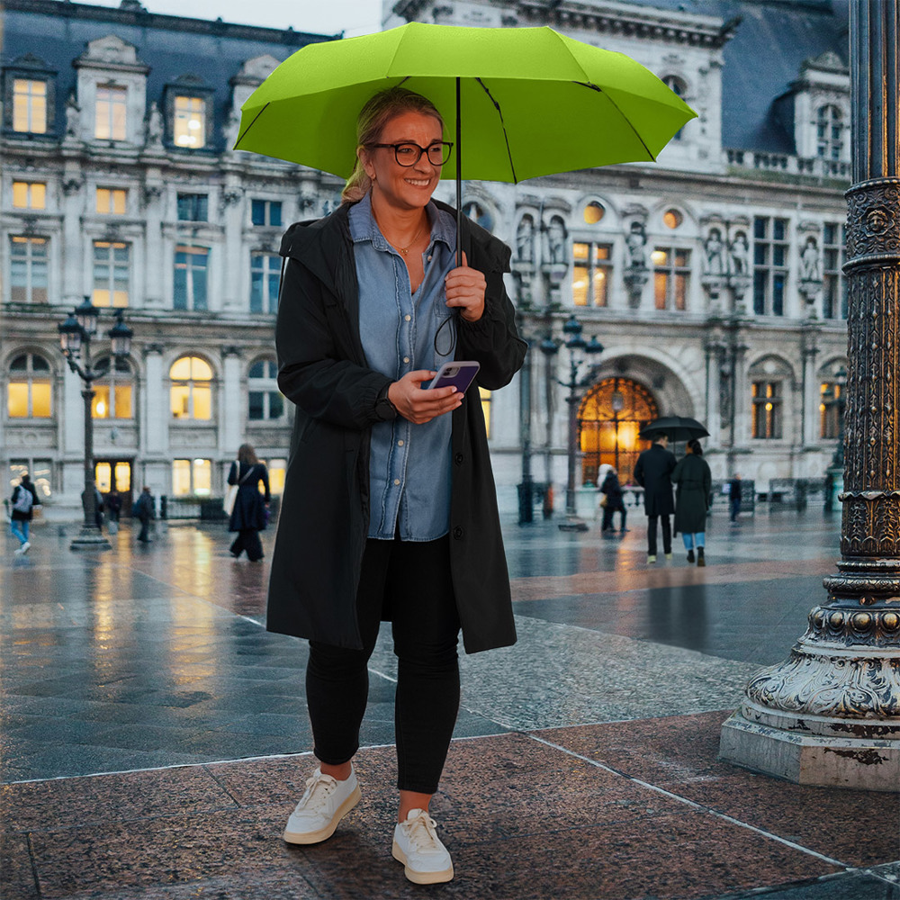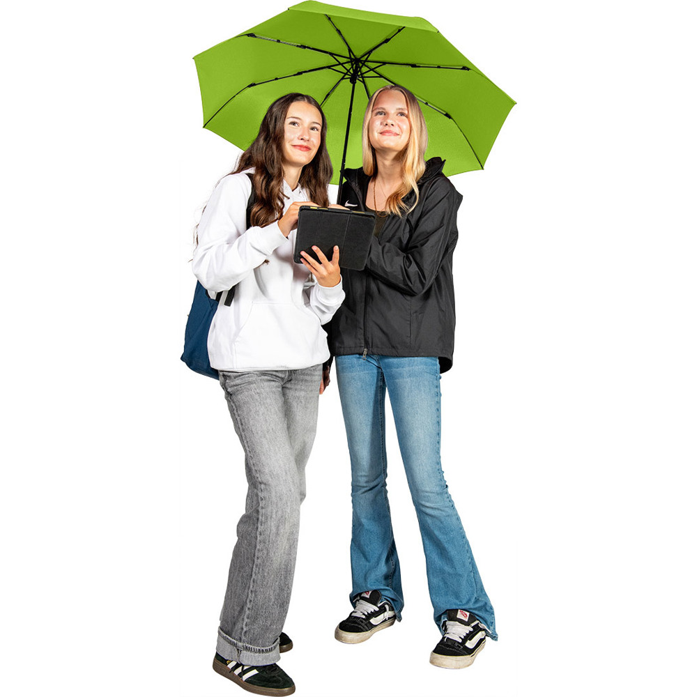 Kompakter Handöffner-Taschenschirm mit hervorragendem Preis-Leistungs-Verhältnis und Windproof-PLUS-System Einfache Handhabung durch Sicherheitsschieber, hochwertiges Windproof-PLUS-System für eine maximale Gestell-Flexibilität bei stärkeren Windböen, Soft-Feel-Griff mit elastischer Tragekordel und Werbeanbringungsmöglichkeit