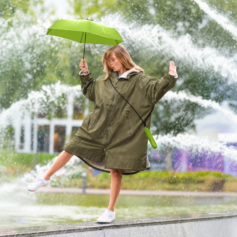 Superleichter Handöffner-Taschenschirm mit abnehmbarem Umhängeband und UV-Schutz Einfache Handhabung durch Sicherheitsschieber, hochwertiges Windproof-PLUS-System für eine maximale Gestell-Flexibilität bei stärkeren Windböen, schwarzer Aluminiumstock, extra leichtes Polyester-Pongee Bezugsmaterial aus recycelten Kunststoffen und mit Lichtschutzfaktor UPF 50+, Kunststoffgriff, Kappe und Lanyard-Klickverschluss aus recyceltem ABS (rABS), Griff mit Werbeanbringungsmöglichkeit, Befestigung des Umhängebandes per Klickverschluss am Futteral oder am Schirm möglich, einfaches Zusammenrollen des Schirms durch breites Schließband
