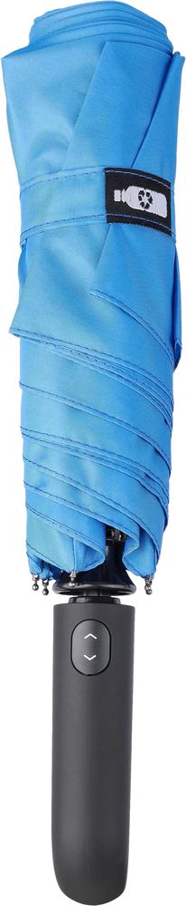 Faltbarer Automatikschirm (27 Zoll) aus rPET 190T mit sechs Paneelen und einem Stahlgestell. Mit einem rPET-Etikett auf dem Klettverschluss und einem Karabinergriff aus Kunststoff. Inklusive Tasche. Winddicht.