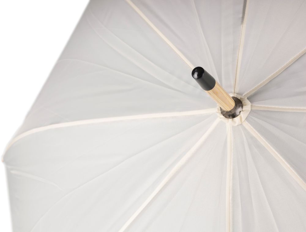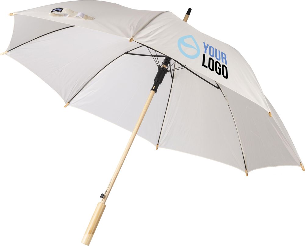 Automatischer Golfschirm rPET 190T mit acht Segmenten und Bambusgriff. Schaft aus Bambus und Stahl mit Metallgestell. Mit Klettverschluss und rPET-Etikett.