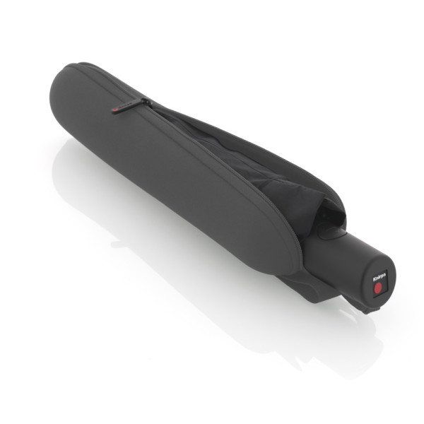 Gestalten Sie Ihren Knirps-Schirm einzigartig! Das Set aus Schirm und passendem Case (30x6,5 cm) eignet sich perfekt als persönliches Geschenk oder stilvolles Firmenpräsent. Das Case bietet zusätzlichen Schutz und praktisches Verstauen – so bleibt Ihr Knirps stets optimal geschützt. Der Knirps A.200 bietet ein 97 cm großes Schirmdach und eine extra breite Drucktaste für einfache Duomatic-Bedienung. Das schwarze Gestell ist sportlich-modern. Dank 8 Streben hält er Windgeschwindigkeiten bis 120 km/h stand.