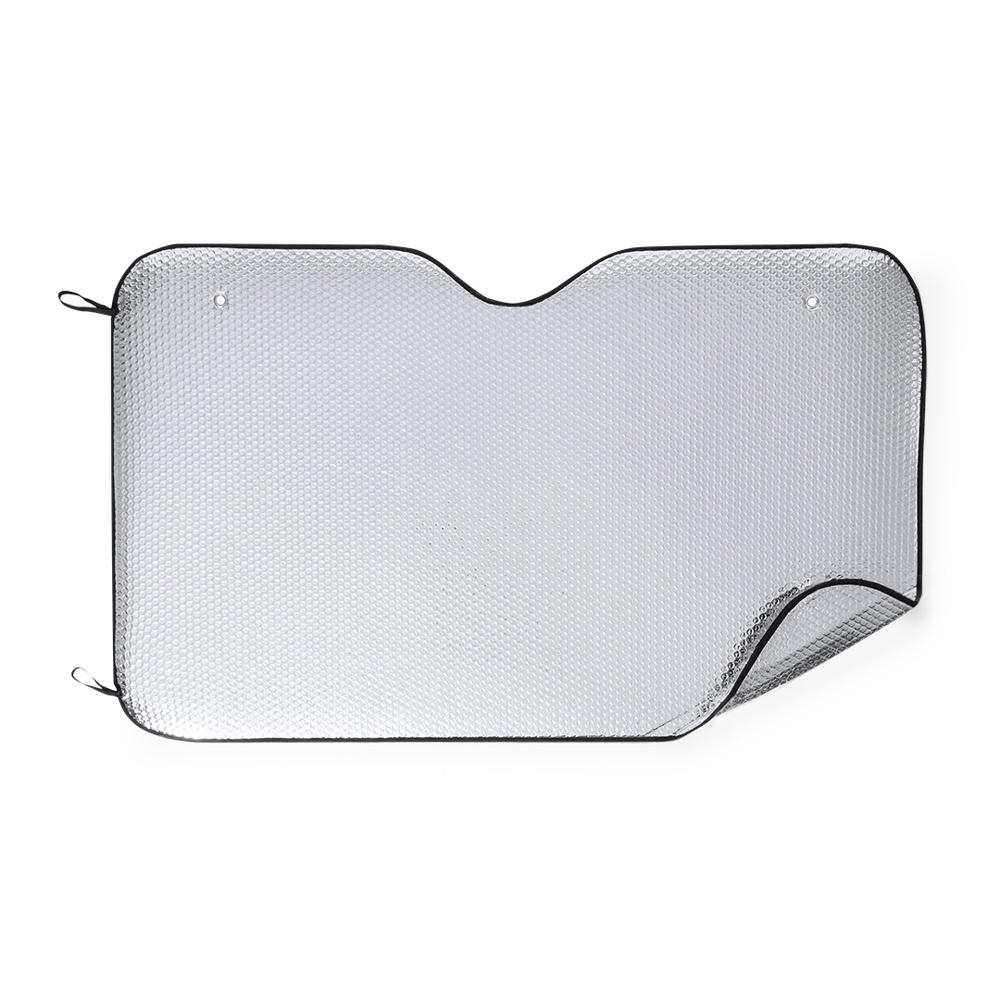 Sonnenschutz aus Aluminum in Silber-Metallic mit schwarzer Paspel. Mit den Maßen 130 x 80 cm, Gummibändern zum Fixieren im gefalteten Zustand, Metallösen zur Verstärkung, sowie zwei Saugnäpfen für die Befestigung an der Windschutzscheibe. Präsentiert in ungefaltetem Zustand für einfaches Bedrucken.