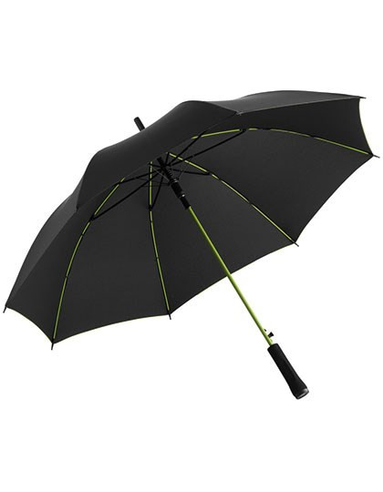 Komfortable Automatik-Funktion zum schnellen Öffnen | Windproof-Features für höhere Gestell-Flexibilität und bessere Windsicherheit | Flexible Fiberglasschienen | Stabiler Stahlstock mit farbiger Kunststoffummantelung | Bezug: 100% Polyester-Pongee (recycelt & waterSAVE®) | Dezente Verzierung des Bezugs durch farbige Nähte | Soft-Touch-Griff mit Auslösetaste und Werbeanbringungsmöglichkeit