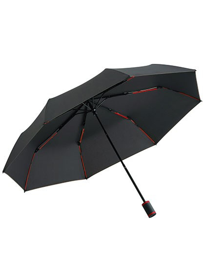 Einfache Handhabung durch Sicherheitsschieber | Hochwertiges Windproof-System für eine maximale Gestell-Flexibilität bei stärkeren Windböen | Flexible Fiberglasschienen | Bezug: 100% Polyester-Pongee (recycelt & waterSAVE®) | Ansprechendes Design durch farbige Schienen, Griffringe und Nähte | Soft-Touch-Griff mit Werbeanbringungsmöglichkeit | Futteral mit farbiger Naht | Griff aus Kunststoff