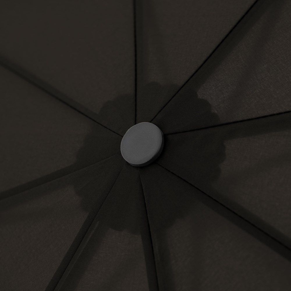 Polyester Pongee, schwarzer Stahlstock, Fiberglas-Teilschienen, mattschwarzer Kunststoffgriff mit integrierter Drucktaste