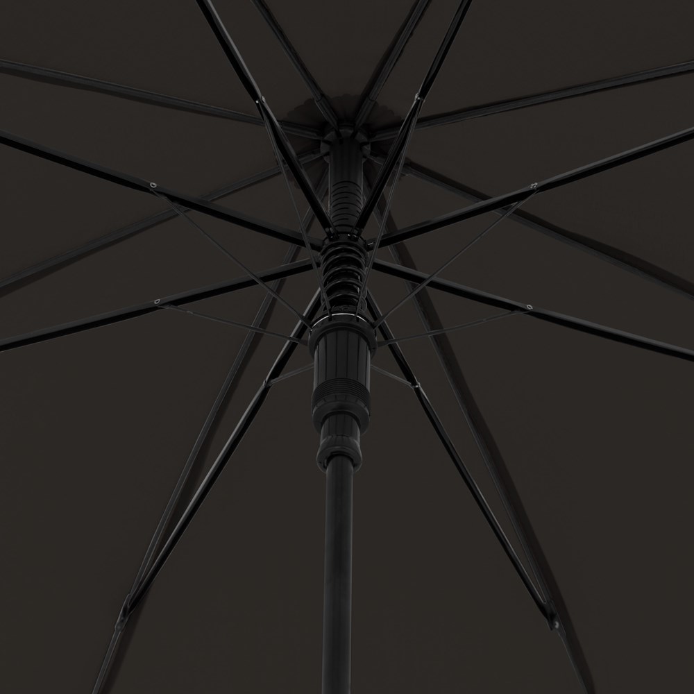 Material: Pongee, Stahlstock, schwarze Fiberglasschienen, mattschwarzer Rundhakengriff