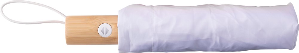 Faltbarer RPET-Regenschirm mit acht Panelen, Klettverschluss und Bambusgriff. Mit automatischem Öffnungs- und Schließknopf. Inklusive Hülle.