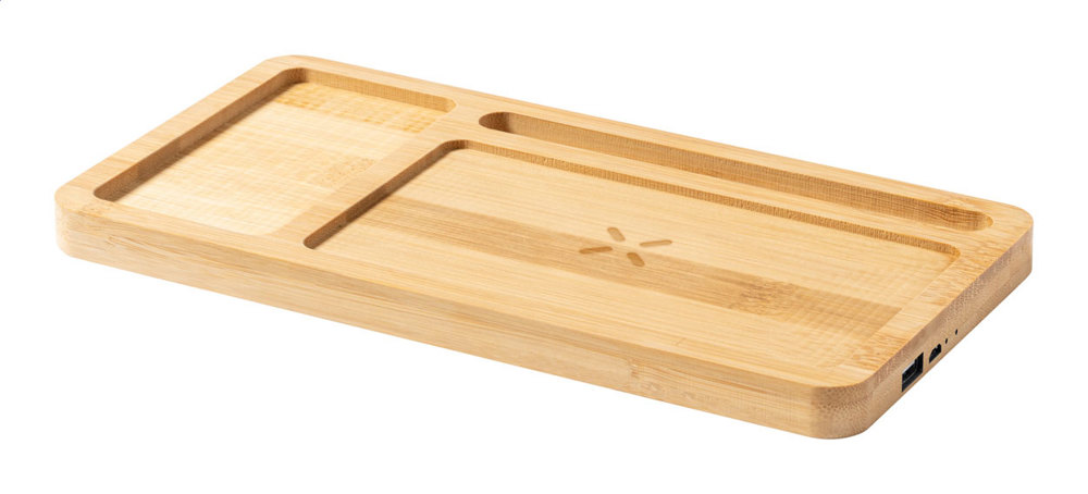 Schreibtisch-Organizer aus Bambus mit Handyhalter und eingebautem Wireless-Fast-Charger (15 W). Mit USB-Ladeport für gleichzeitige Ladung von 2 Geräten (1 kabellos / 1 per Kabel). Max. Ausgang: 2000 mA. Inkl. USB-Ladekabel.