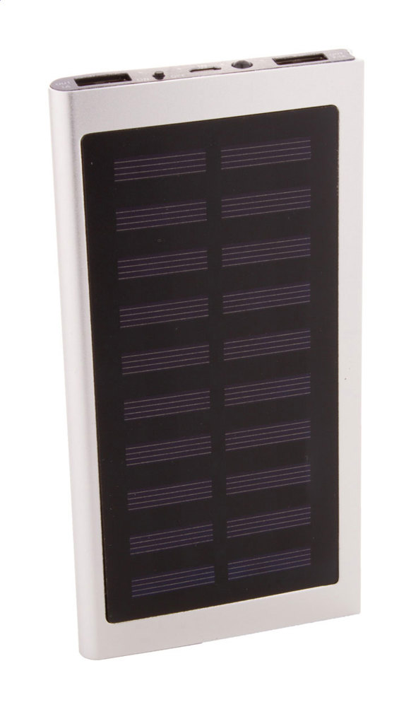 Powerbank im Gehäuse aus recyceltem Aluminium mit integriertem Solarladegerät und 4000-mAh-Akku. Mit 2 USB- und 1 USB-C-Ladeanschlüssen. USB-C-Eingangsport. Inklusive USB-Ladekabel.