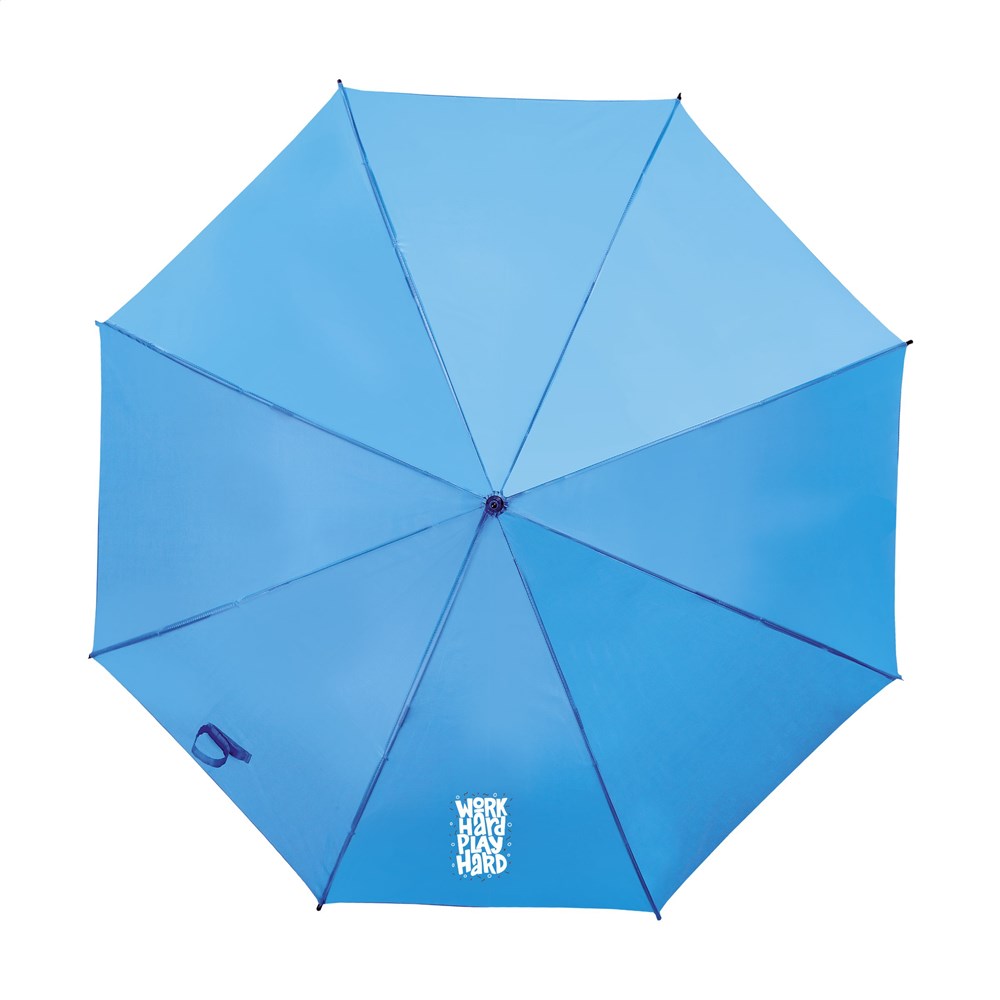 Regenschirm mit automatischer Teleskopöffnung, 190T Polyester-Bespannung, Fiberglasrahmen, Metallschaft, Softgriff und Klettverschluss.