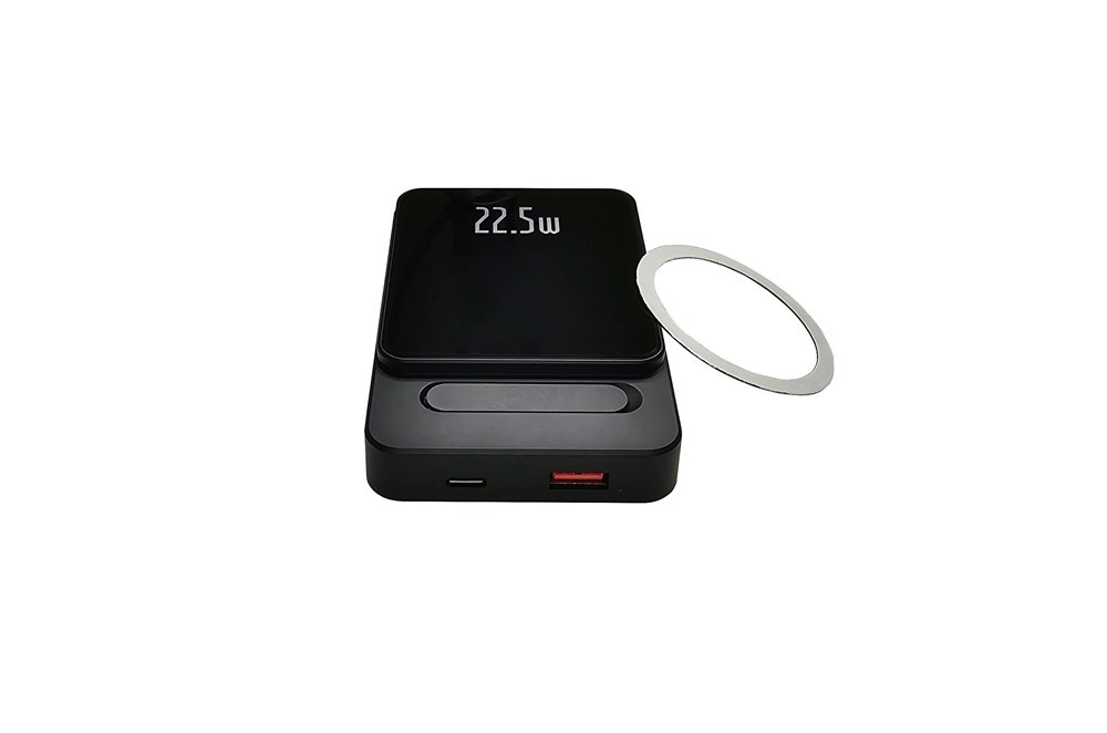 Material: ABS, Acrylglas, Metall Größe (L x B x H): 104 x 69 x 19 mm Gewicht: 206 g Standardfarbe/n: schwarz, silber Sondereinfärbung Kunststoff in Wunschfarbe auf Anfrage Veredelungsart: - Druck - Digitaldruck CMYK - UV Digitaldruck - HD Digitaldruck Veredelungsbereich Vorderseite: 60 x 45mm / Rückseite: 60 x 15mm Besondere Produkteigenschaften: Magnet zur Befestigung der Powerbank am Smartphone (MagSafe), QI Wireless Charging Funktion (Aufladen ohne Kabel), LCD Akkustandanzeige, Aufklappbarer Handyhalter aus Metall