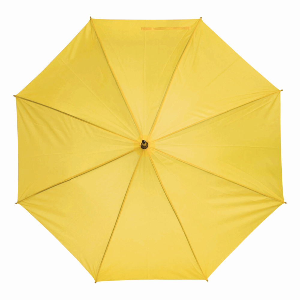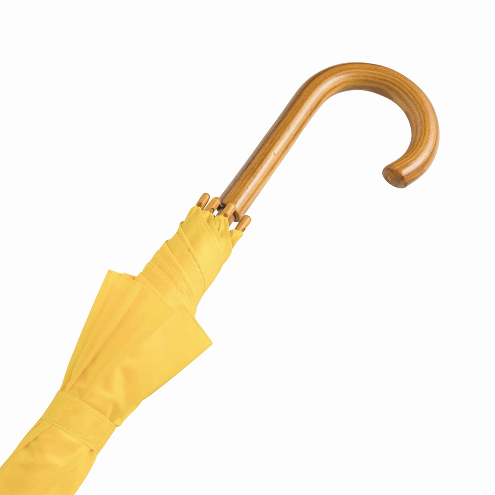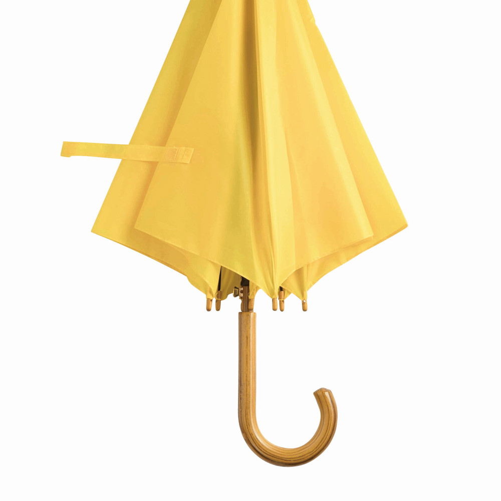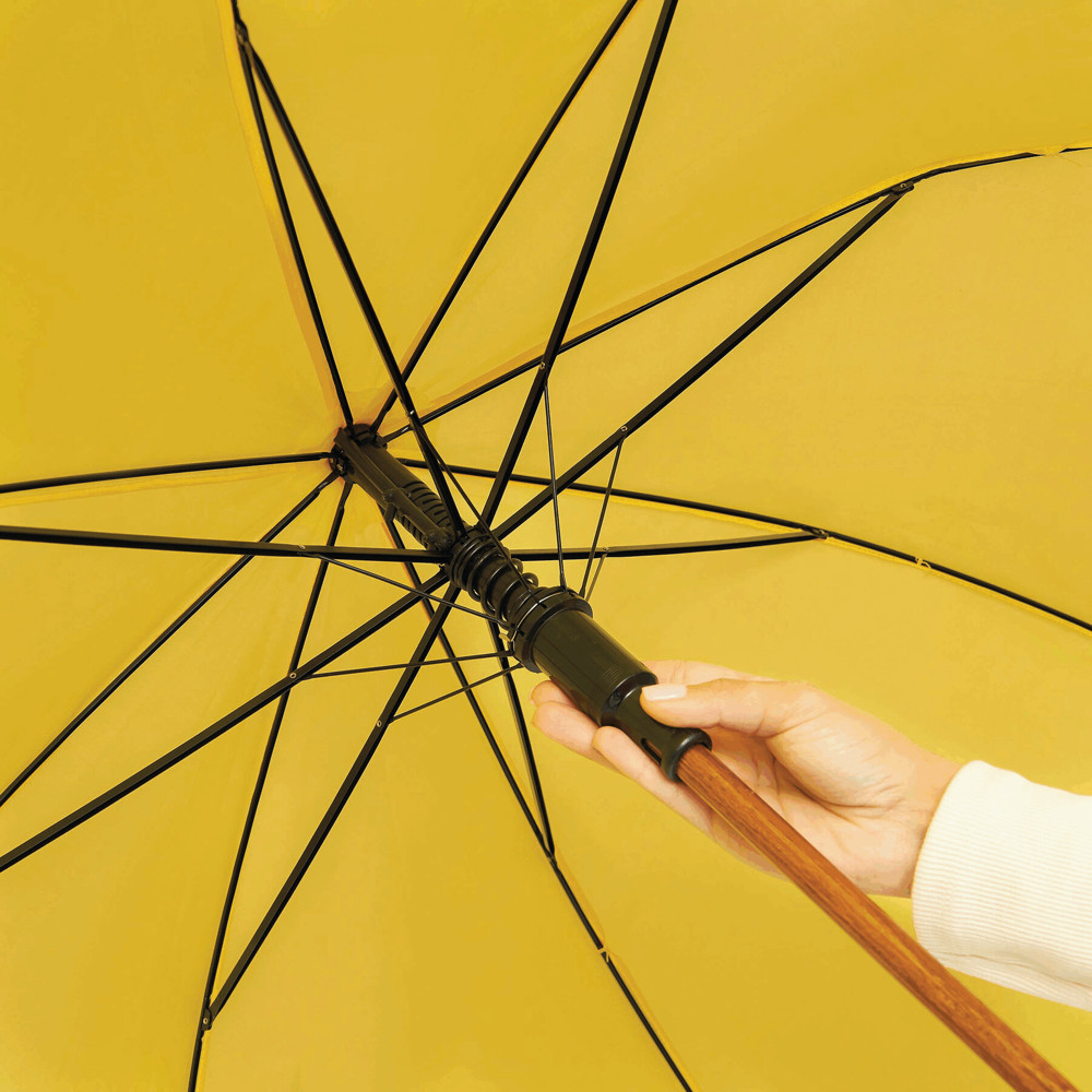 Automatik-Holzstockschirm TANGO: Metallspeichen, Holztips und -Rundhakengriff, Polyester-Bespannung, Schließband mit Klettverschluss