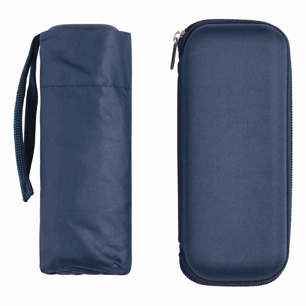 Aluminium-Mini-Taschenschirm POCKET mit farblich abgestimmtem Futteral, im EVA-Etui: 164g-leichtes Gestell, 5-teiliger Aluminiumstock, mit Aluminium- / Fiberglasspeichen und Metalltips, gummierter Griff mit Handschlaufe, Polyester-Pongee-Bespannung, Schließband mit Klettverschluss