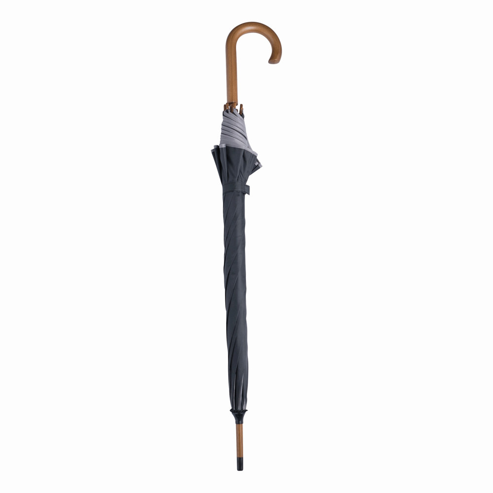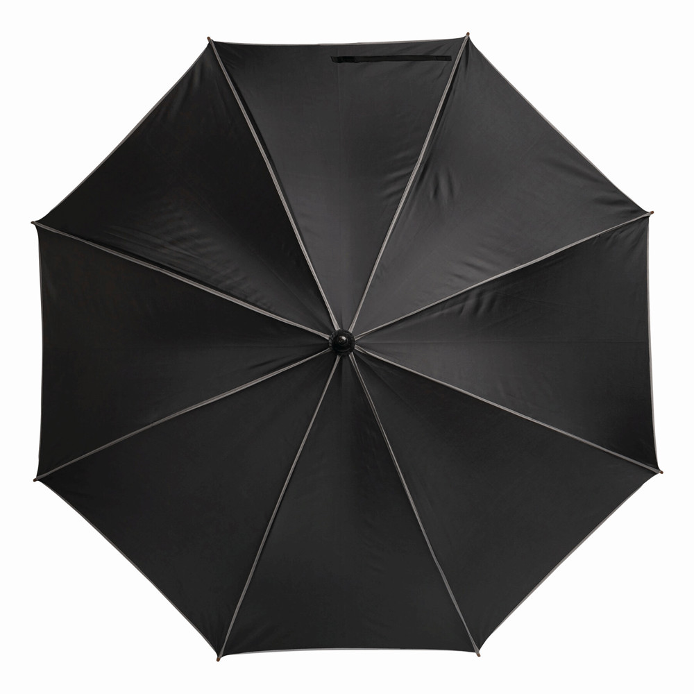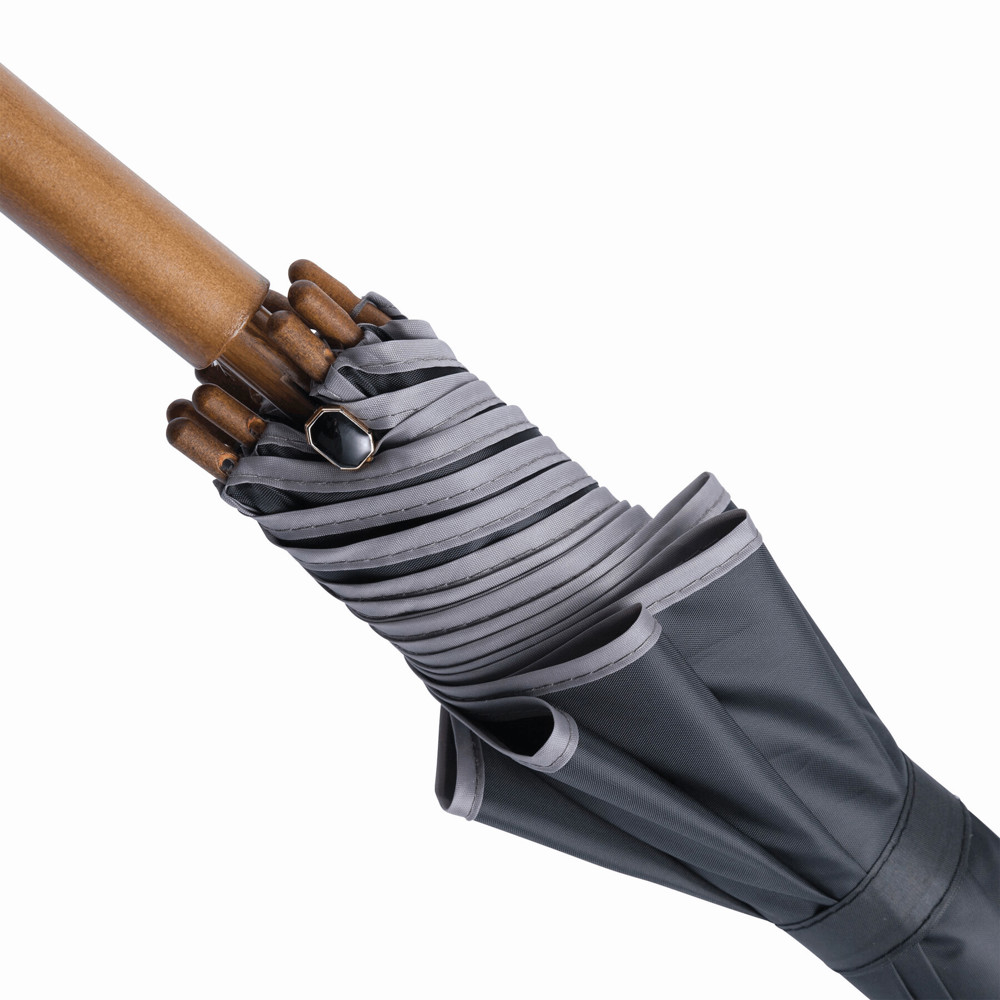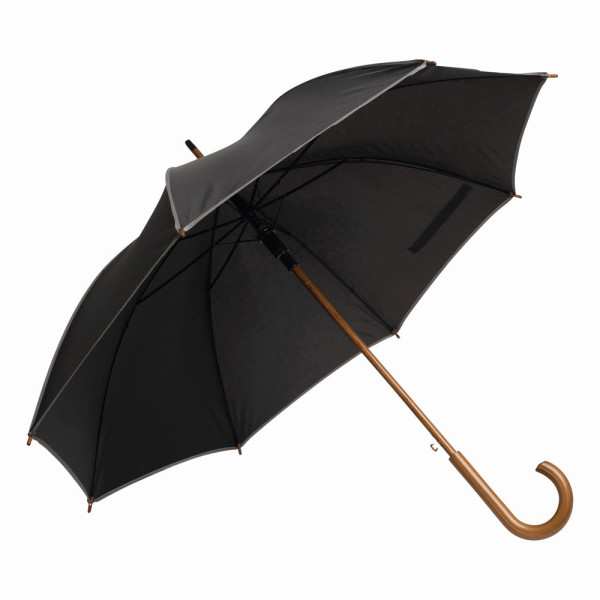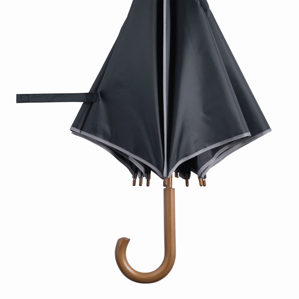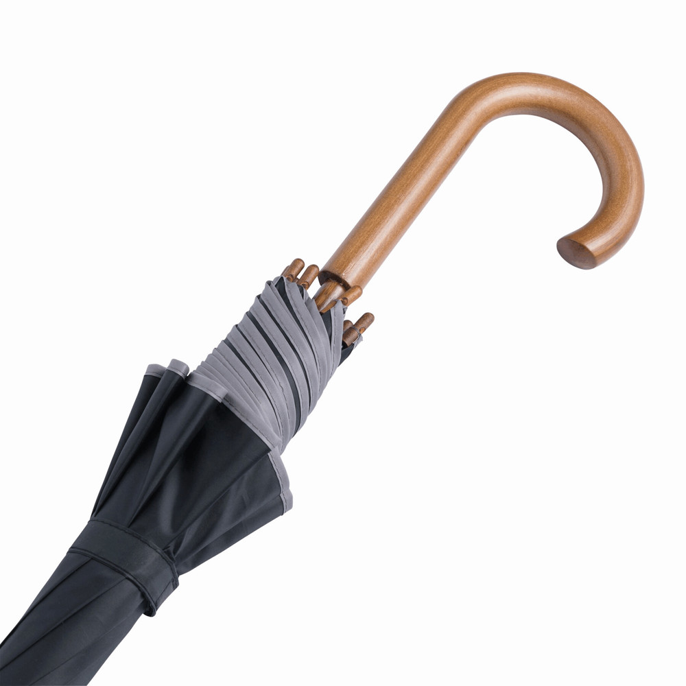Automatik-Holzstockschirm WALTZ mit farbiger Paspelierung: Metallspeichen, Holztips und -Rundhakengriff, Polyester-Bespannung, Schließband mit Klettverschluss