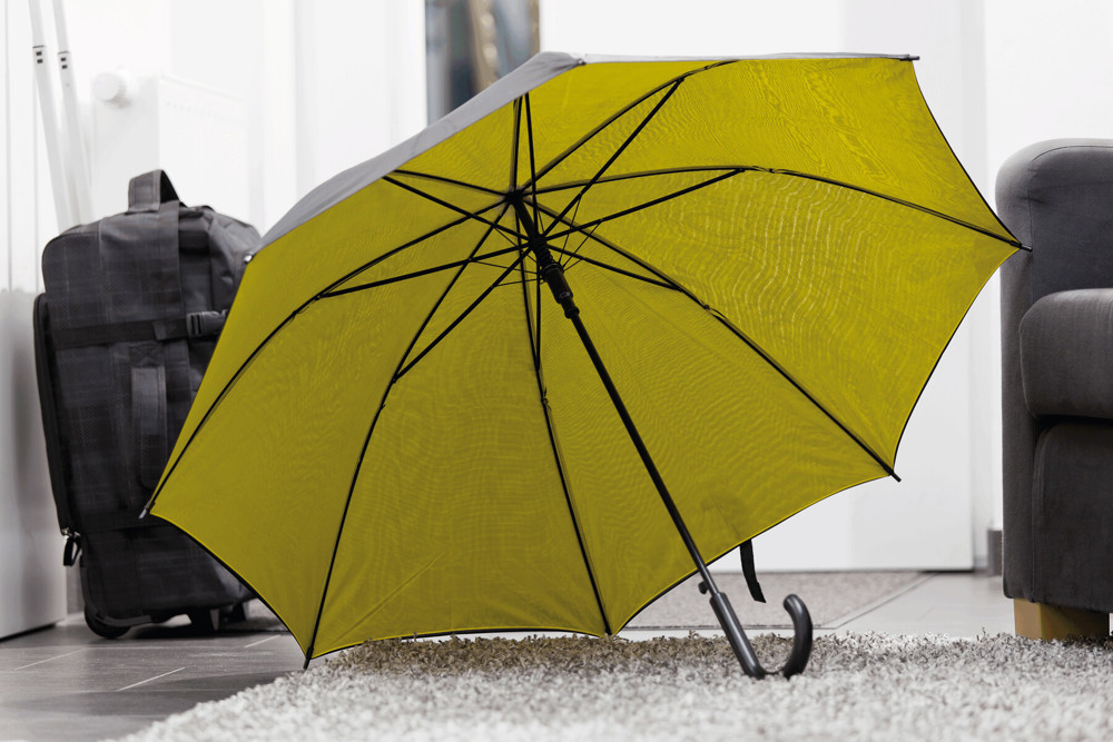 Automatik-Stockschirm DOUBLY: Metallstock und -speichen, Kunststofftips und -Rundhakengriff, doppelt bespanntes und zweifarbiges Schirmdach, Polyester-Bespannung, Schließband mit Klettverschluss