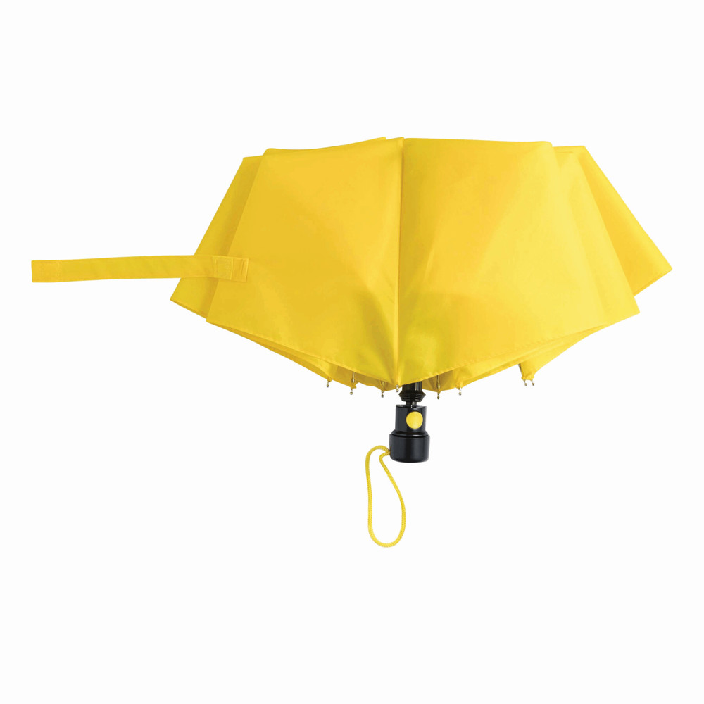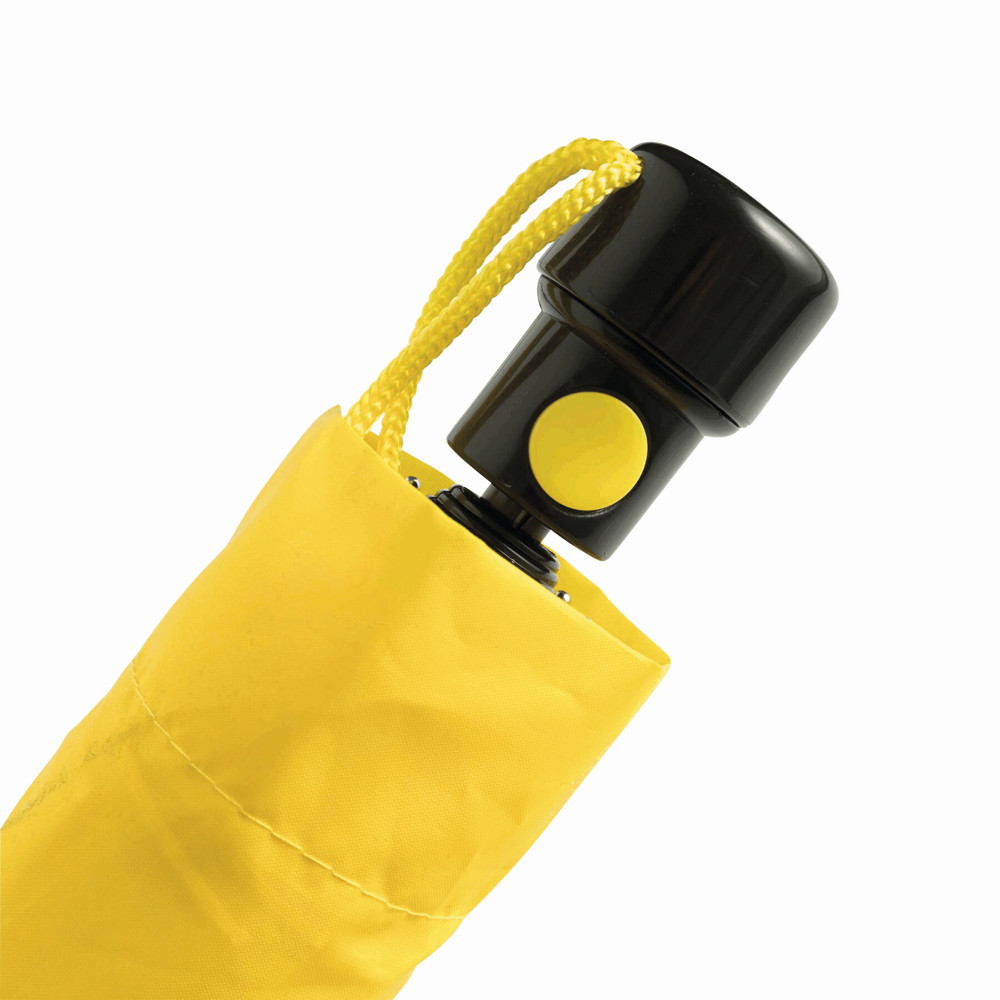 Automatik-Taschenschirm PRIMA, im farblich abgestimmten Futteral: 3-teiliger Metallstock, Metallspeichen und -tips, schwarzer Kunststoffknauf mit farblich abgestimmter Automatik-Auslösetaste und Handschlaufe, Polyester-Bespannung und Schließband mit Klettverschluss