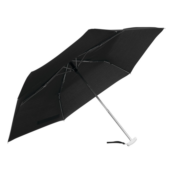 Super flacher Mini-Taschenschirm FLAT: in farblich abgestimmtem Futteral: 164g-leichtes Windproof-Gestell, 3-teiliger Aluminiumstock, mit Aluminium- / Fiberglasspeichen und Metalltips, Kunststoffgriff mit Handschlaufe, Polyester-Pongee-Bespannung, Schließband mit Klettverschluss