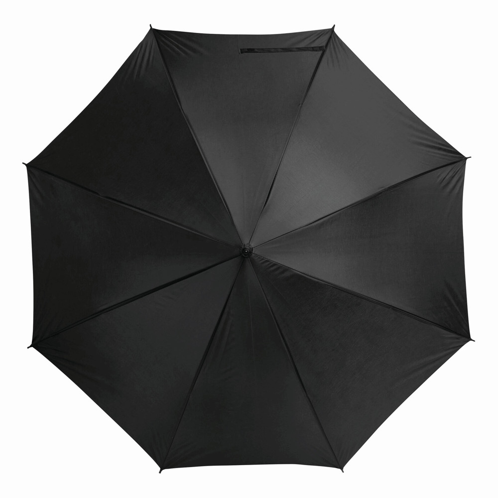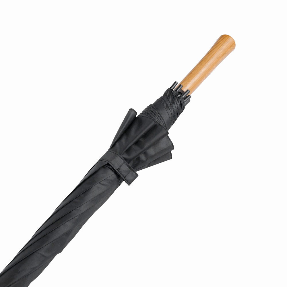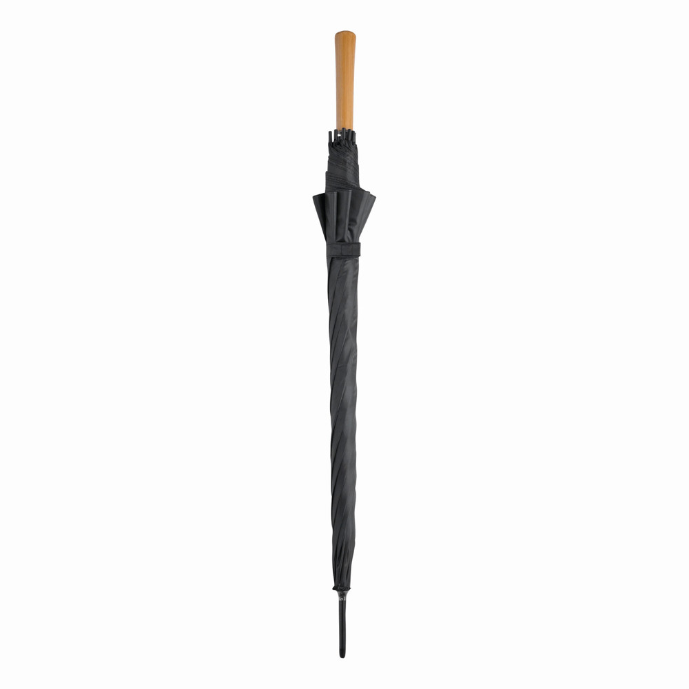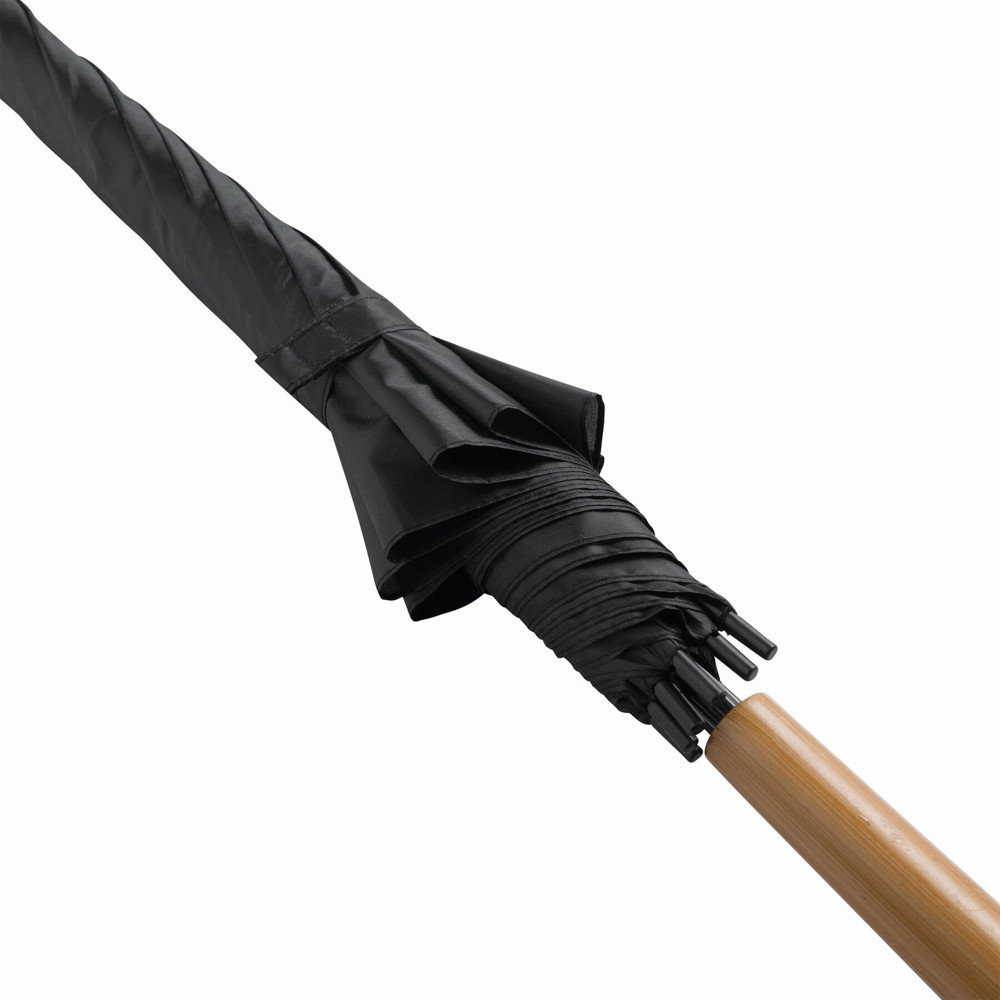 Automatik-Stockschirm LIMBO: Metallstock und -speichen, farblich abgestimmte Kunststofftips, Griff in Holz-Optik, Polyester-Bespannung, Schließband mit Klettverschluss