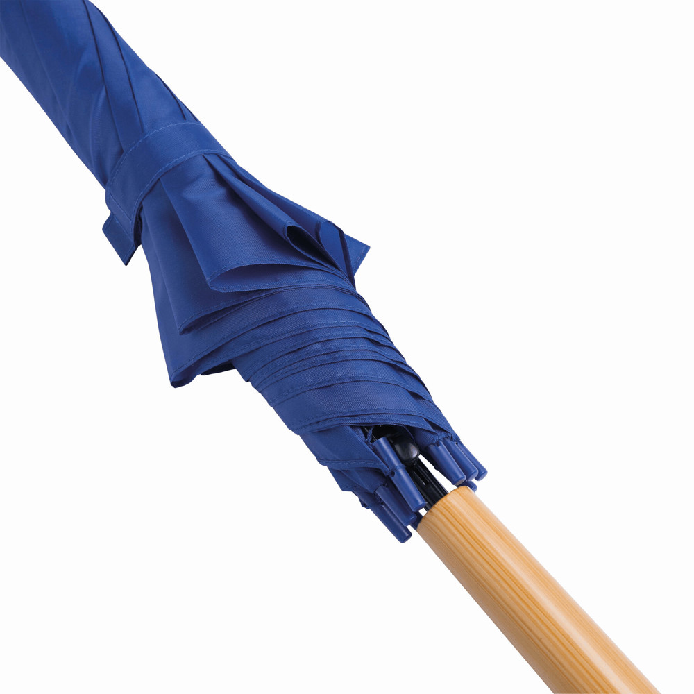 Automatik-Stockschirm LIMBO: Metallstock und -speichen, farblich abgestimmte Kunststofftips, Griff in Holz-Optik, Polyester-Bespannung, Schließband mit Klettverschluss