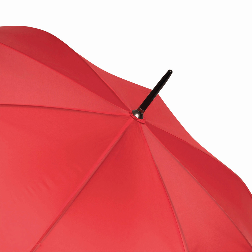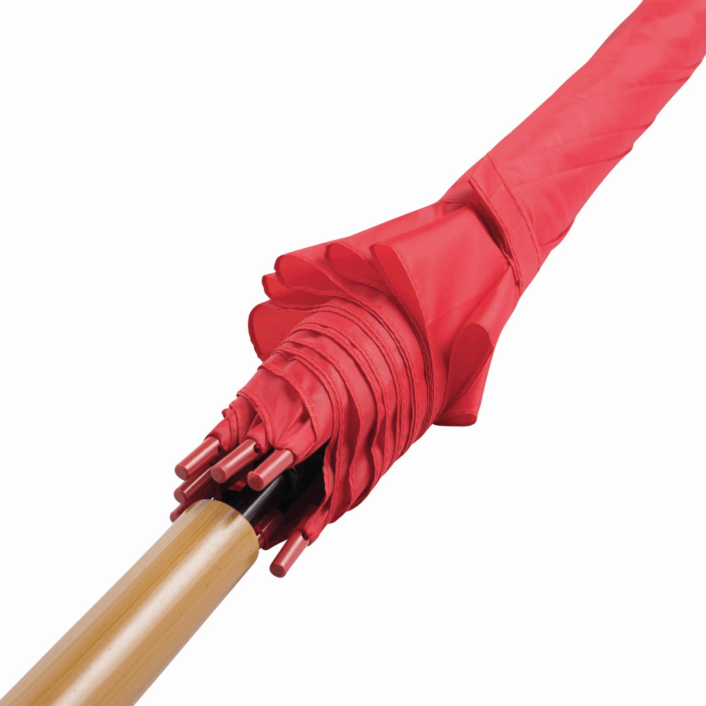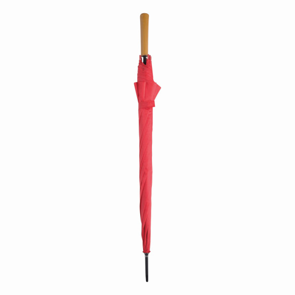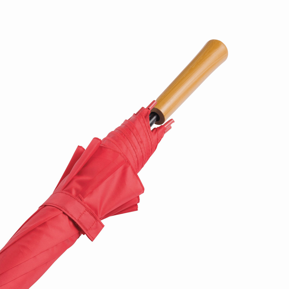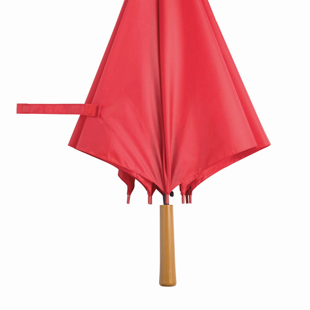 Automatik-Stockschirm LIMBO: Metallstock und -speichen, farblich abgestimmte Kunststofftips, Griff in Holz-Optik, Polyester-Bespannung, Schließband mit Klettverschluss