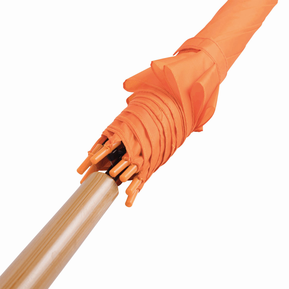 Automatik-Stockschirm LIMBO: Metallstock und -speichen, farblich abgestimmte Kunststofftips, Griff in Holz-Optik, Polyester-Bespannung, Schließband mit Klettverschluss