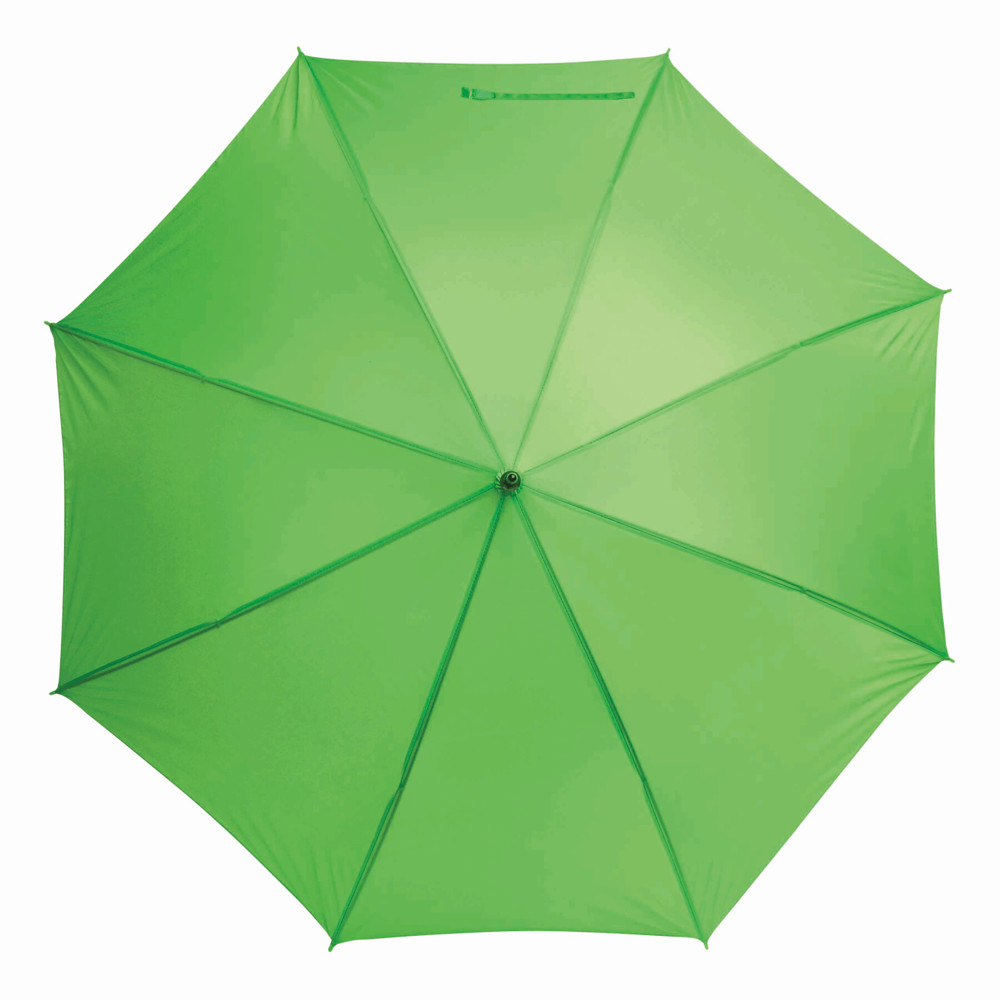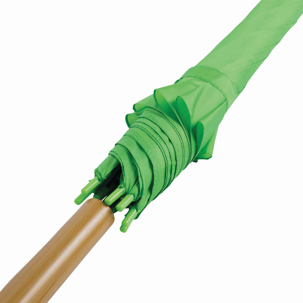 Automatik-Stockschirm LIMBO: Metallstock und -speichen, farblich abgestimmte Kunststofftips, Griff in Holz-Optik, Polyester-Bespannung, Schließband mit Klettverschluss
