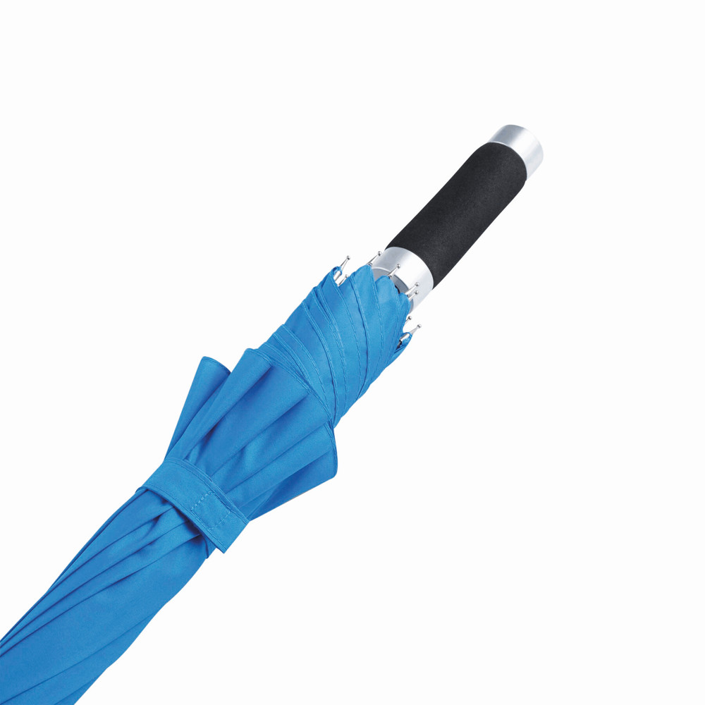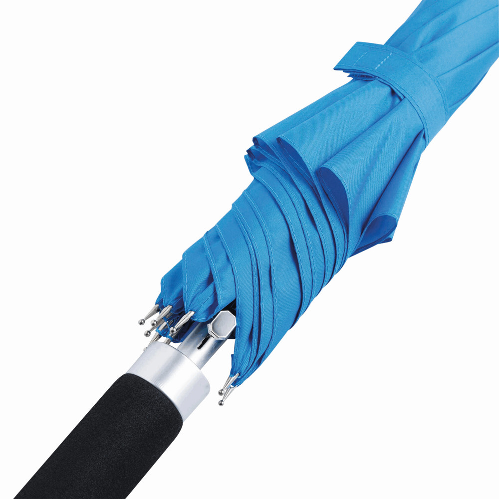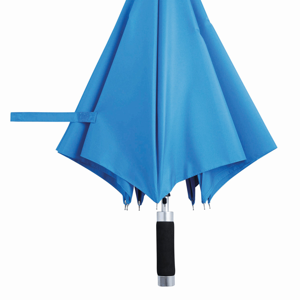 Automatik-Stockschirm RUMBA: Aluminiumstock, Fiberglasspeichen und Metalltips, Aluminium-EVA-Griff, Polyester-Pongee-Bespannung und -Hülle, Schließband mit Klettverschluss